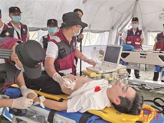 緊急醫學救援隊員為“傷員”做B超。