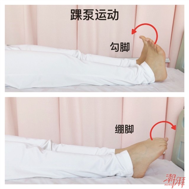 主動運動:清醒患者做踝泵運動(勾腳背-繃腳背),每小時10次。