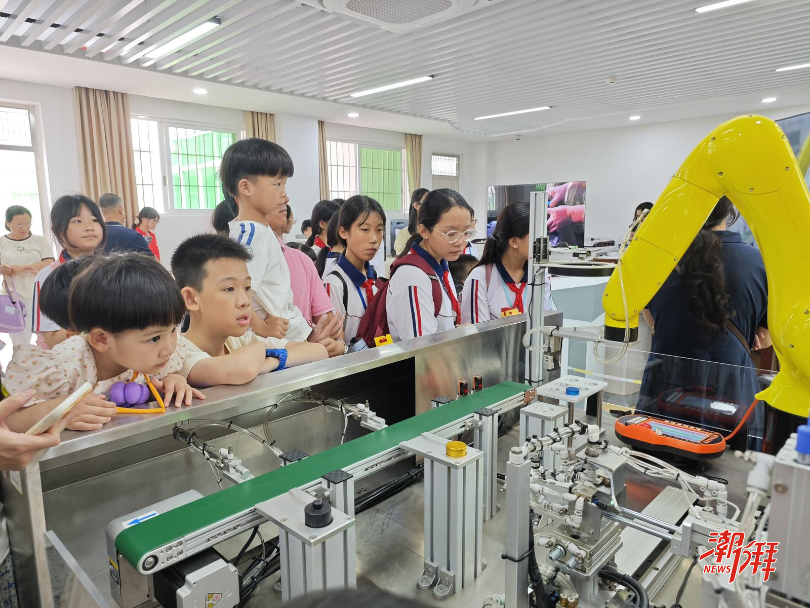 在志愿者的帶領下,同學們走進韓山師院,開啟了一場奇妙的“科學之旅”。在物理與電子工程學院的實驗室里,同學們近距離接觸了機器人、3D打印機、智慧工廠系統。“光亮程度可以控制飛機的速度”“可以人造龍卷風”“機器人也會垃圾分類”……神奇的物理實驗深深吸引了同學們的目光。在天文館,通過天文科普望遠鏡,同學們穿透云層,觀測日月盈虧、追逐行星軌跡,將浩瀚宇宙、璀璨星辰盡收眼底。