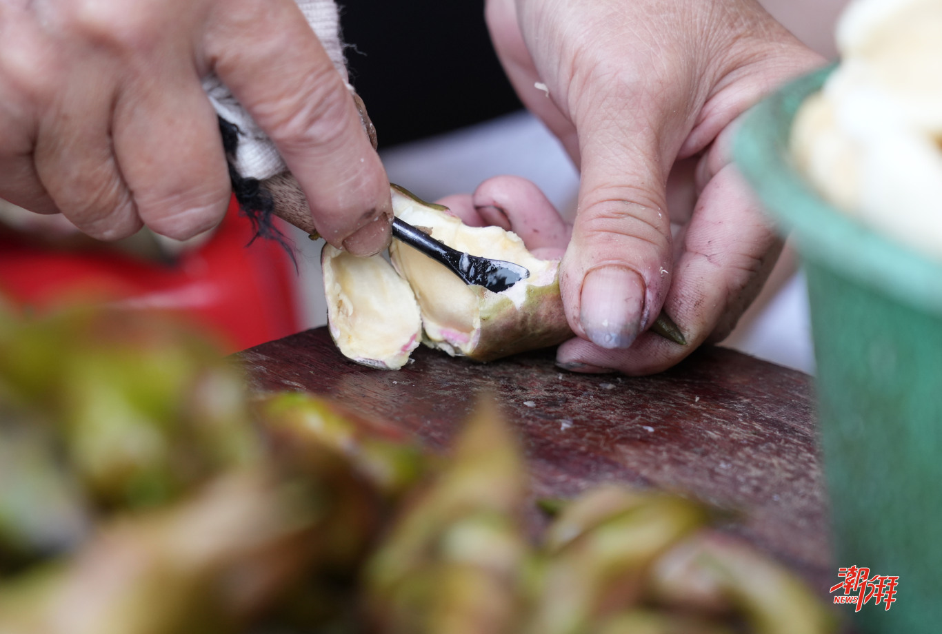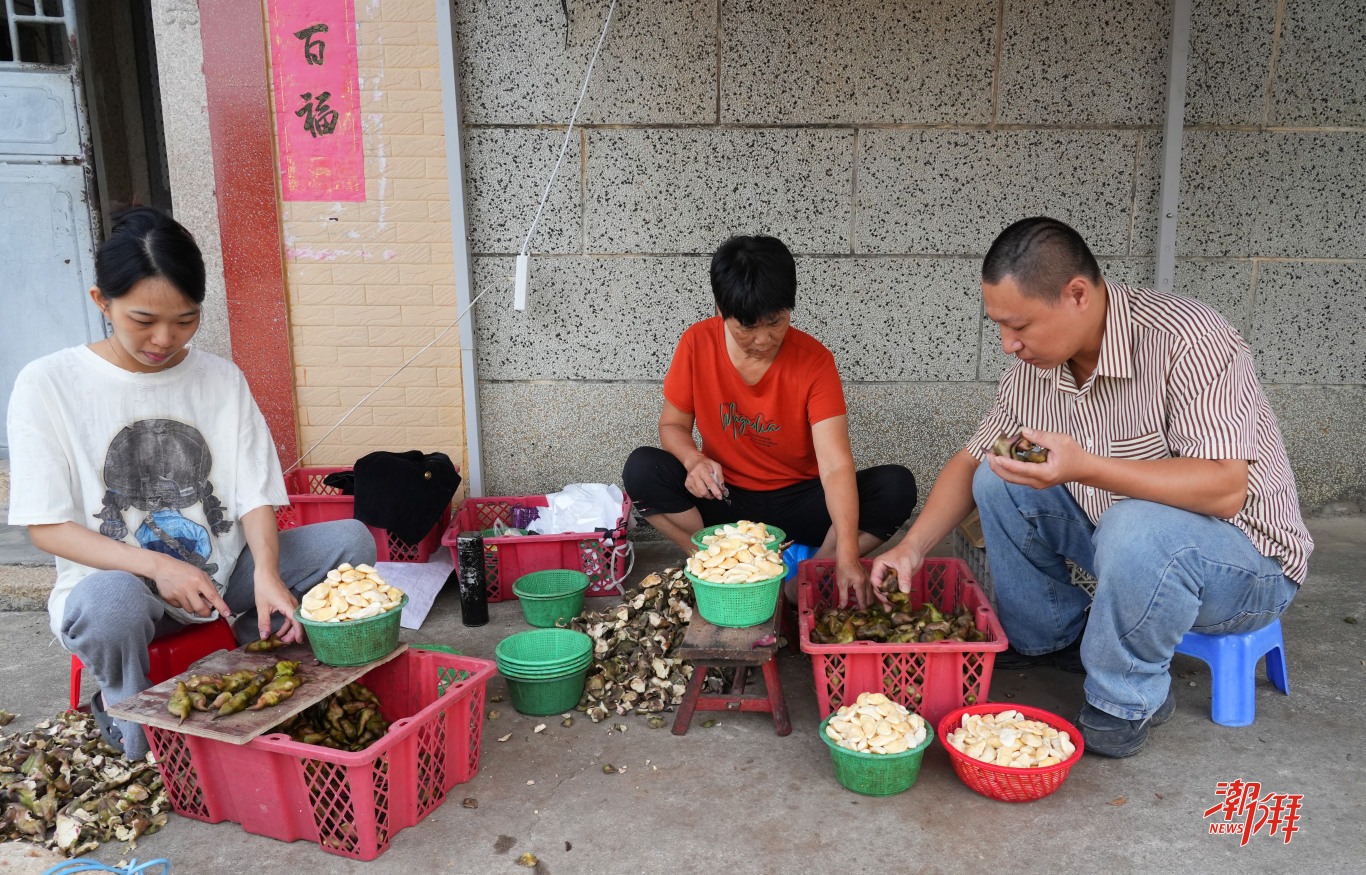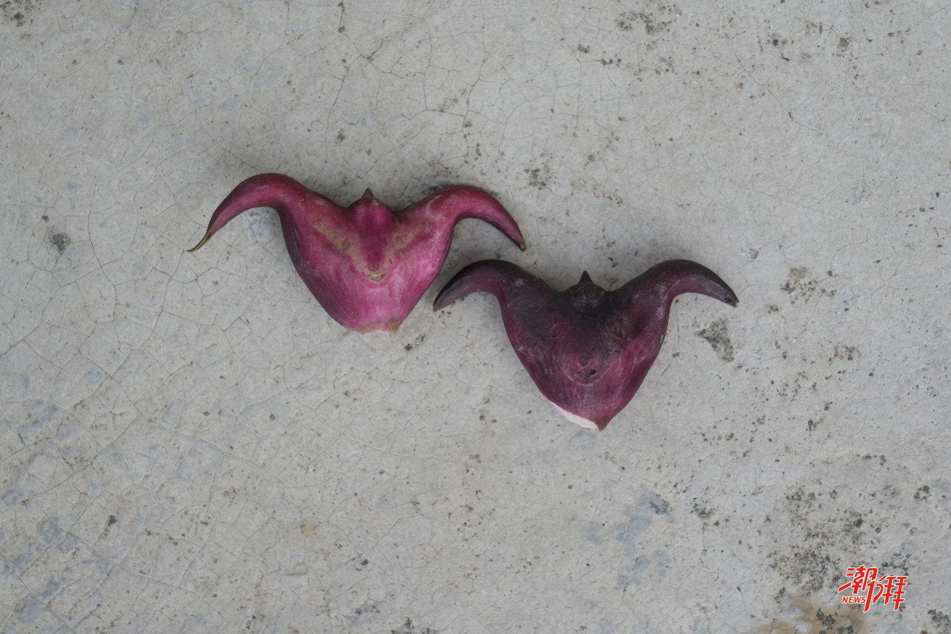 女人們坐在屋前的空地上,手持特制撬刀,從菱角中間撬開,“咔嗒”一聲脆響,青殼綻開,雪白的菱肉被放入竹簍。紅褐里帶青的菱角為青匙品種,粉糯爽脆的口感十分討喜。稚嫩的菱角味道清甜,直接生吃也頗為可口。而種植面積較少的紅菱則是老品種,因其清熱解毒、利尿消腫和美容養顏等功效更顯珍貴,其口感較青匙菱更為香甜。