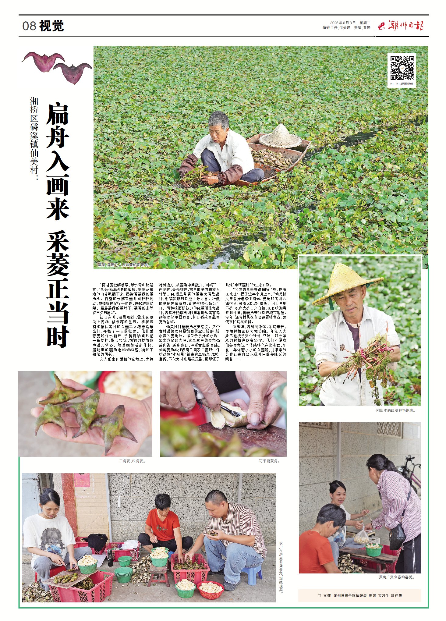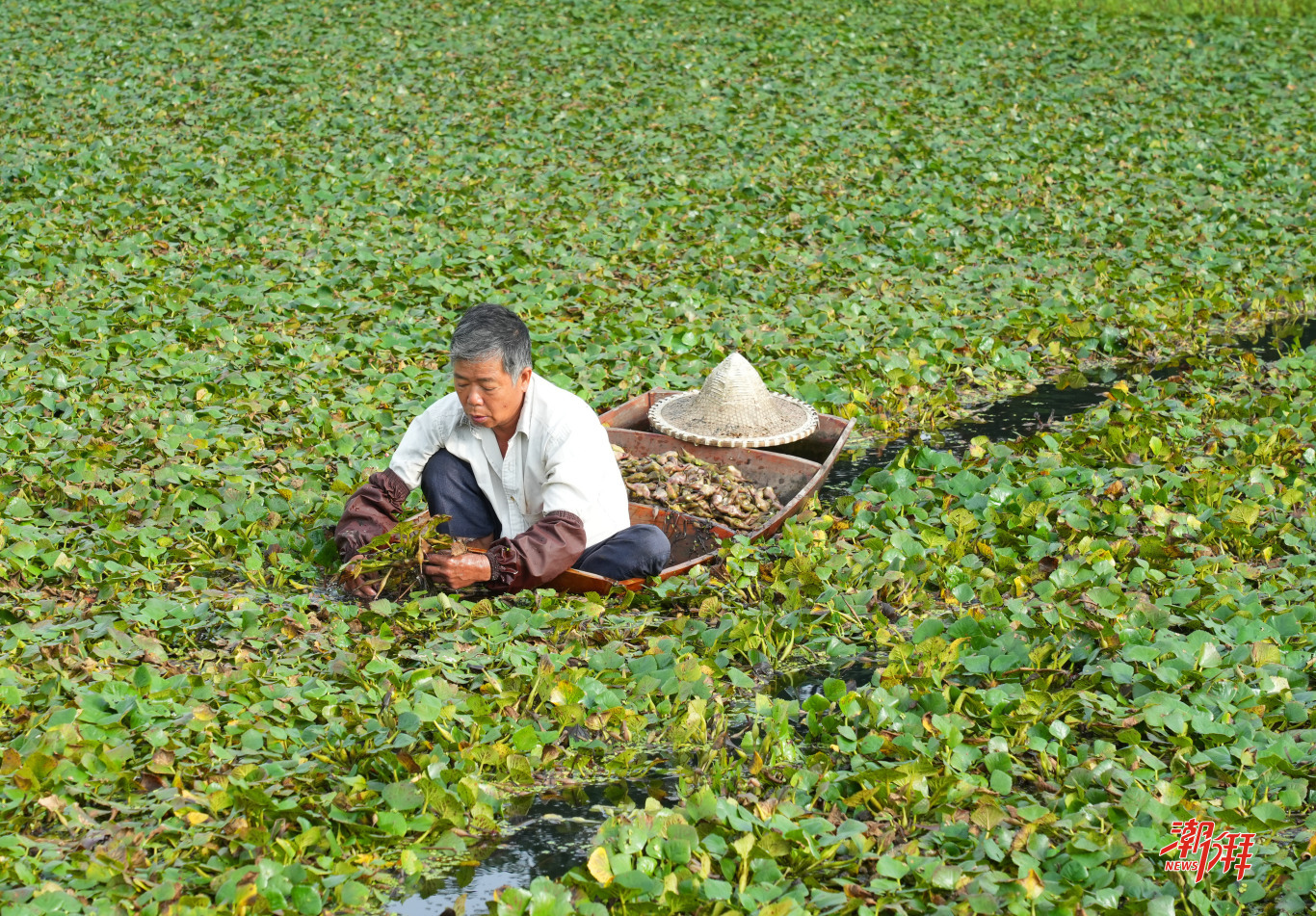 紅日東升,薄霧如紗,露珠在草尖上閃爍,似未落的星辰。湘橋區磷溪鎮仙美村的采菱工人踏著晨曦出門,開始了一天的忙碌。他們乘著菱船劃水前進,手腕抖動間拎起一串菱株,指尖輕捻,飽滿的菱角應聲落入掌心。隨著朝陽漸漸升起,船艙里的菱角也越堆越高,漫過了船舷的陰影。