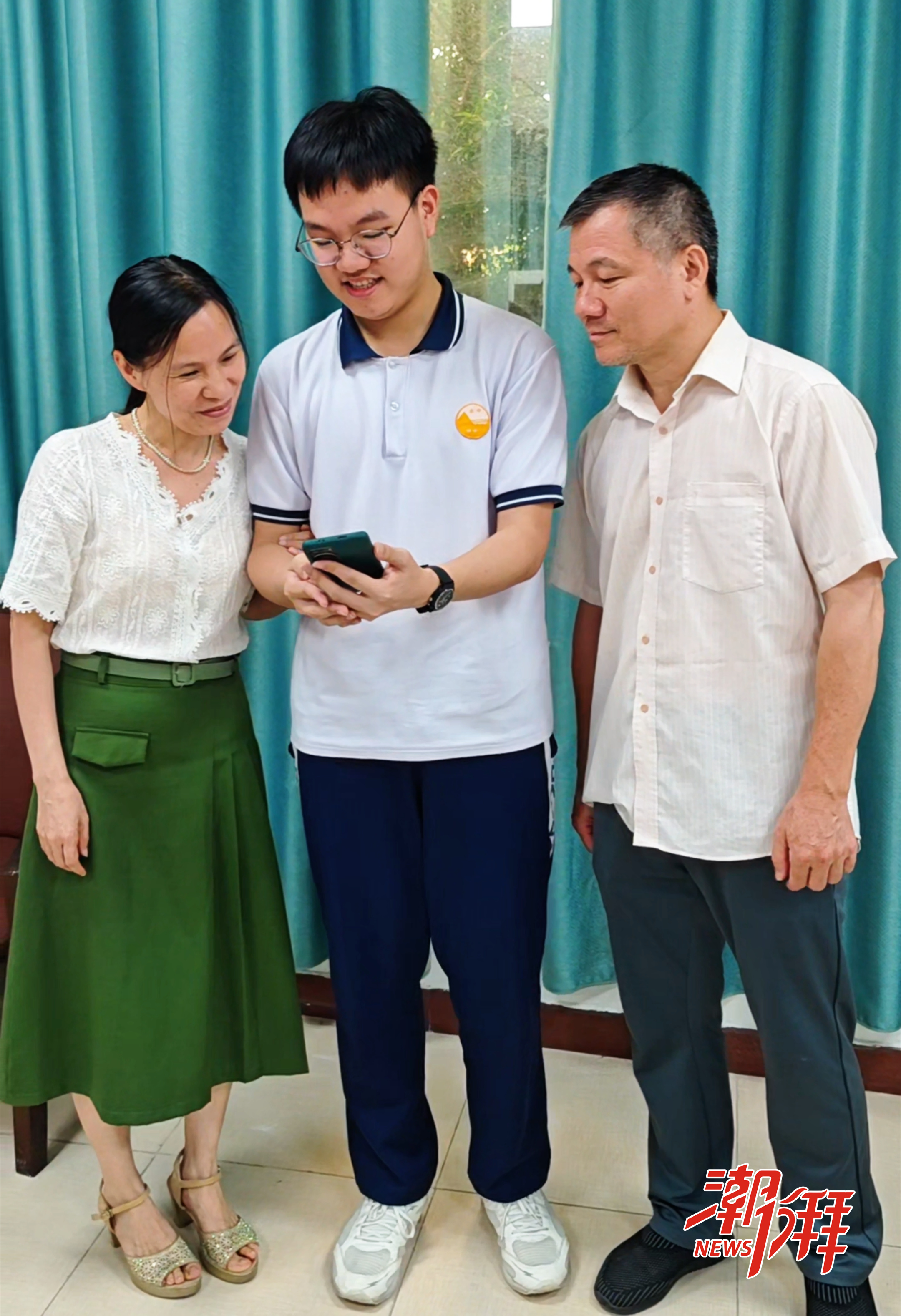 賴栩平和家長(zhǎng)分享成績(jī)。潮州日?qǐng)?bào)全媒體記者 丁汝櫻 攝