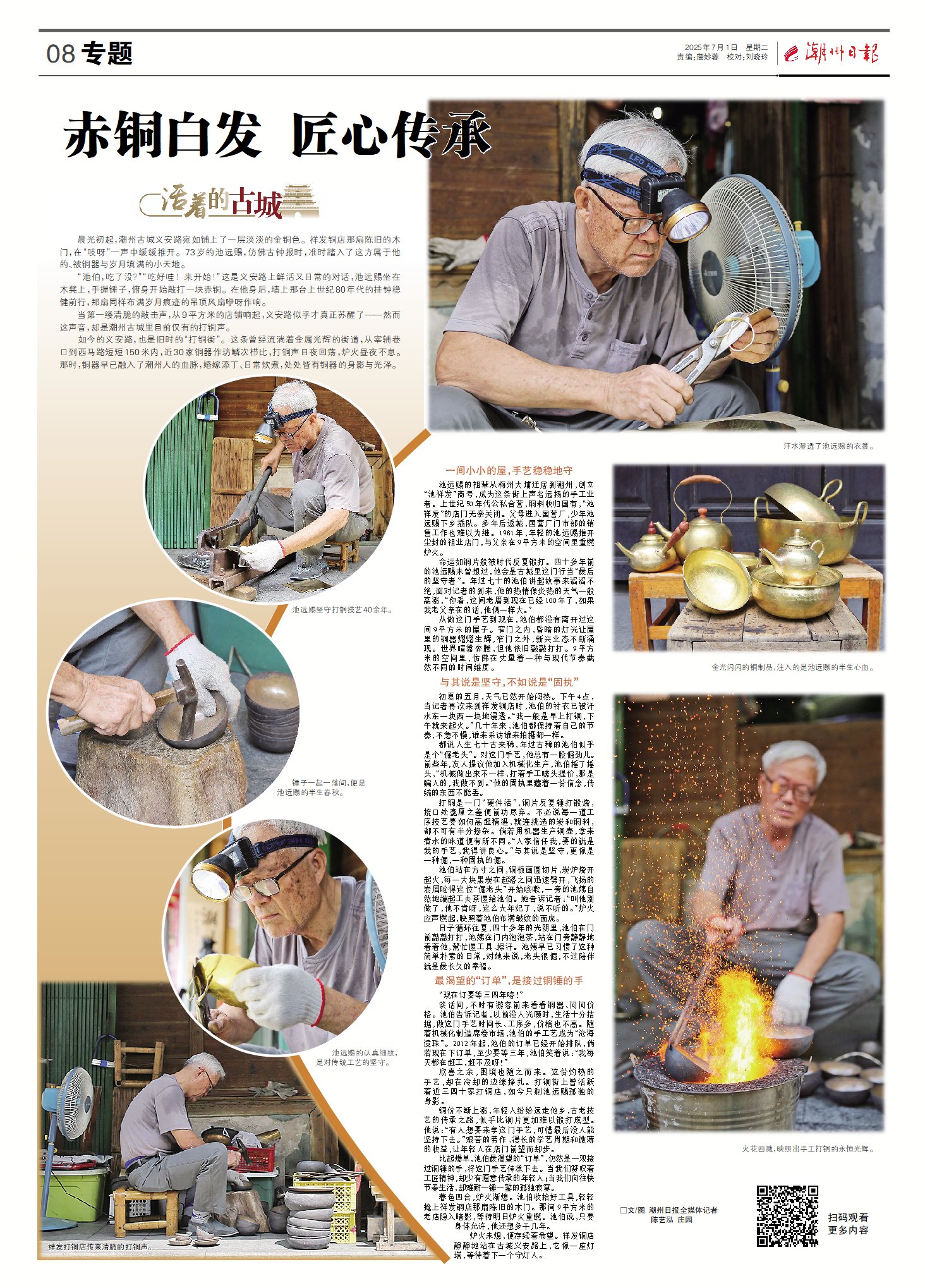 晨光初起,潮州古城義安路宛如鋪上了一層淡淡的金銅色。祥發(fā)銅店那扇陳舊的木門,在“吱呀”一聲中緩緩推開。73歲的池遠賜,仿佛古鐘報時,準時踏入了這方屬于他的、被銅器與歲月填滿的小天地。