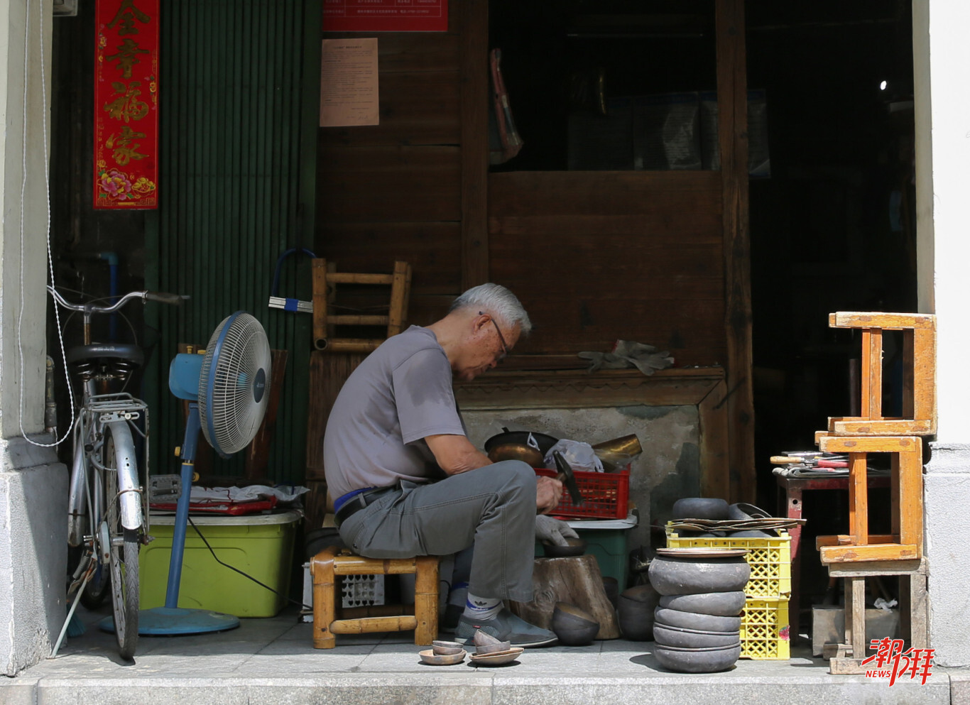 命運如銅片般被時代反復鍛打。四十多年前的池遠賜未曾想過,他會是古城里這門行當“最后的堅守者”。年過七十的池伯講起故事來滔滔不絕,面對記者的到來,他的熱情像炎熱的天氣一般高漲,“你看,這間老厝到現(xiàn)在已經(jīng)100年了,如果我老父親在的話,他倆一樣大。”