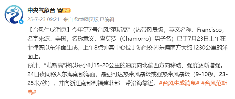 剛剛!7號(hào)臺(tái)風(fēng)“范斯高”生成!趨向浙閩沿海!
