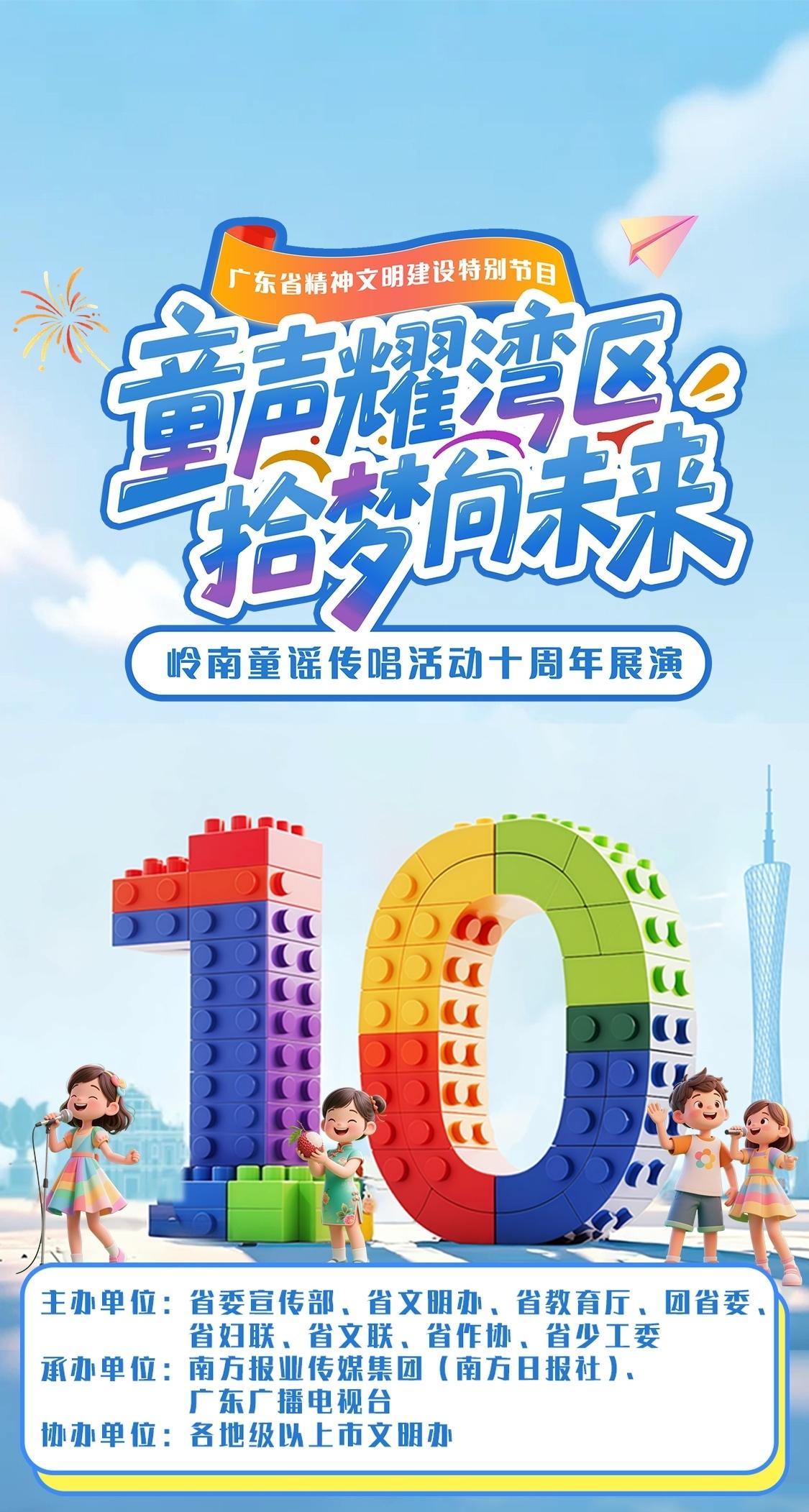 植根嶺南文化沃土,歷經十載耕耘培育,嶺南童謠如珠江潮水般浸潤著南粵大地的童年記憶,串聯起灣區共同的文化血脈。7月24日,廣東省精神文明建設特別節目——“童聲耀灣區 拾夢向未來”嶺南童謠傳唱活動十周年展演,將在廣州中山紀念堂盛大啟幕。