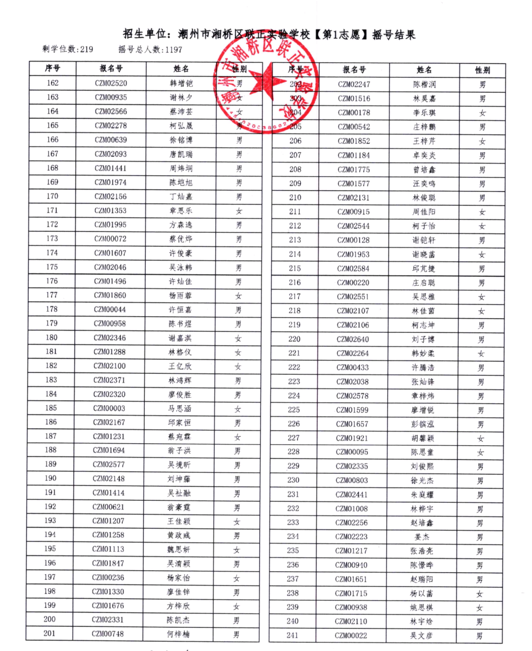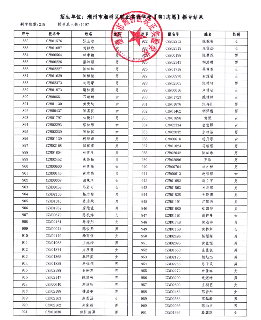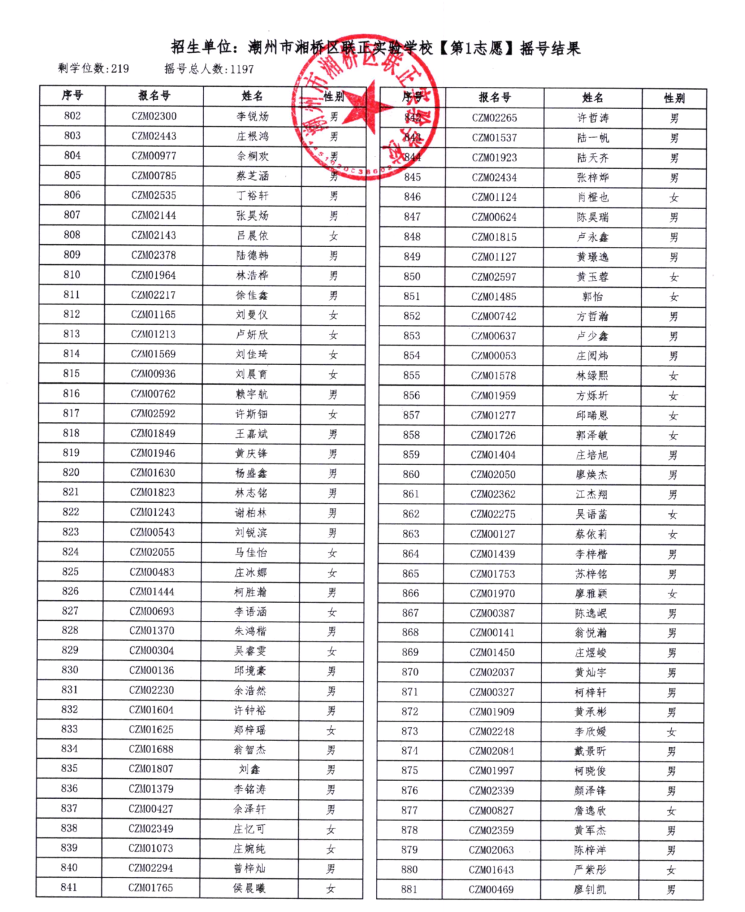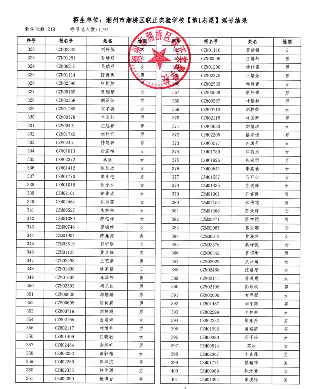 湘橋區聯正實驗學校初中一年級搖號招生結果公布