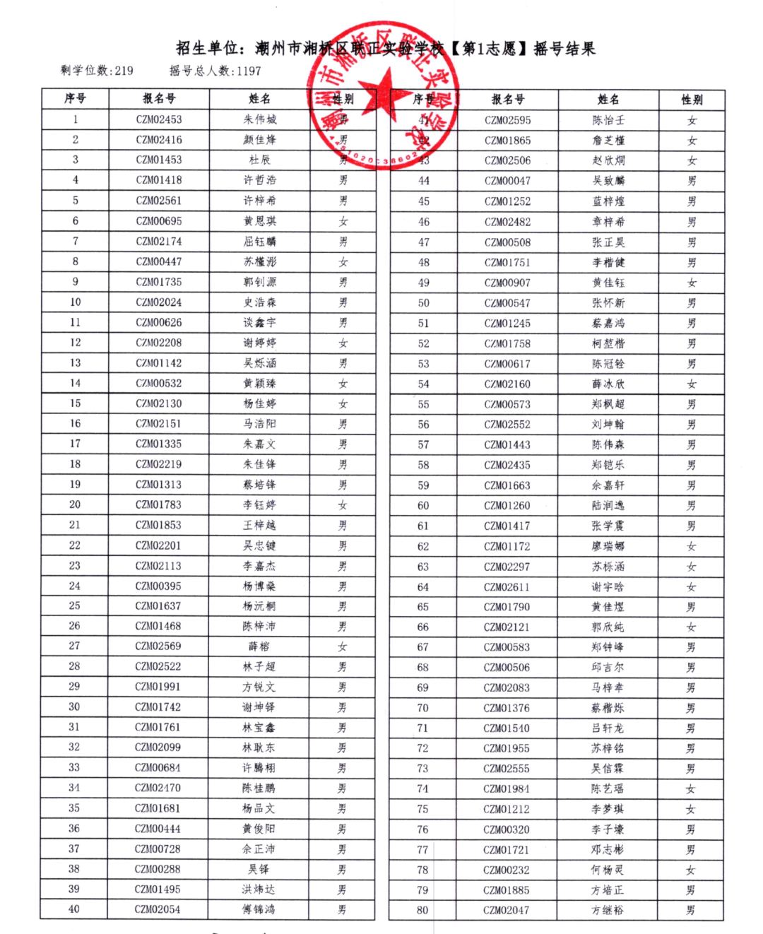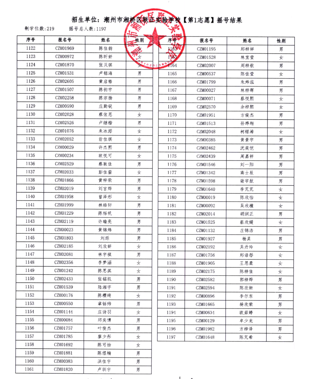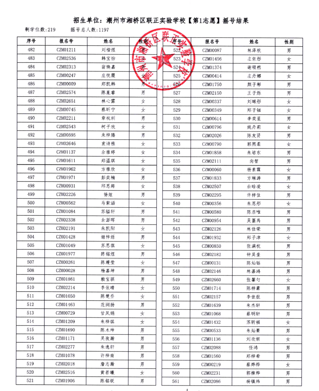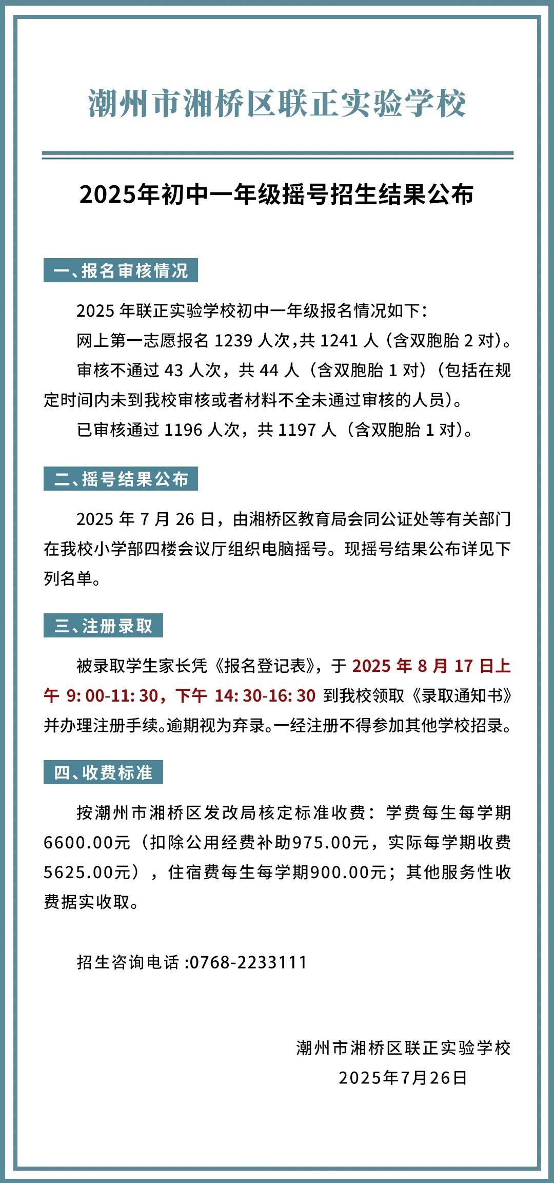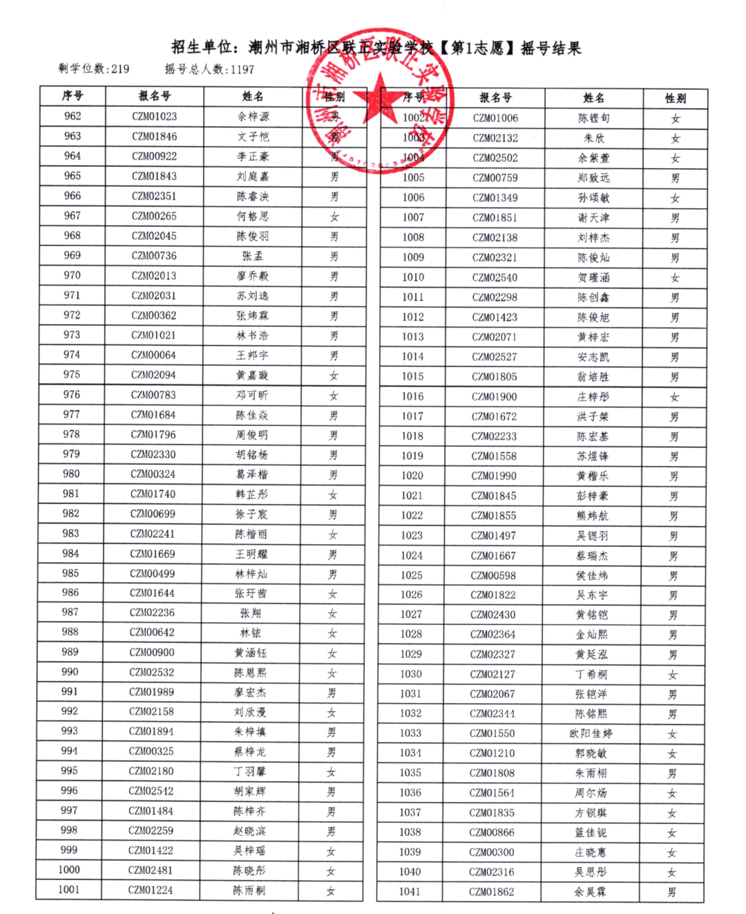 湘橋區聯正實驗學校初中一年級搖號招生結果公布