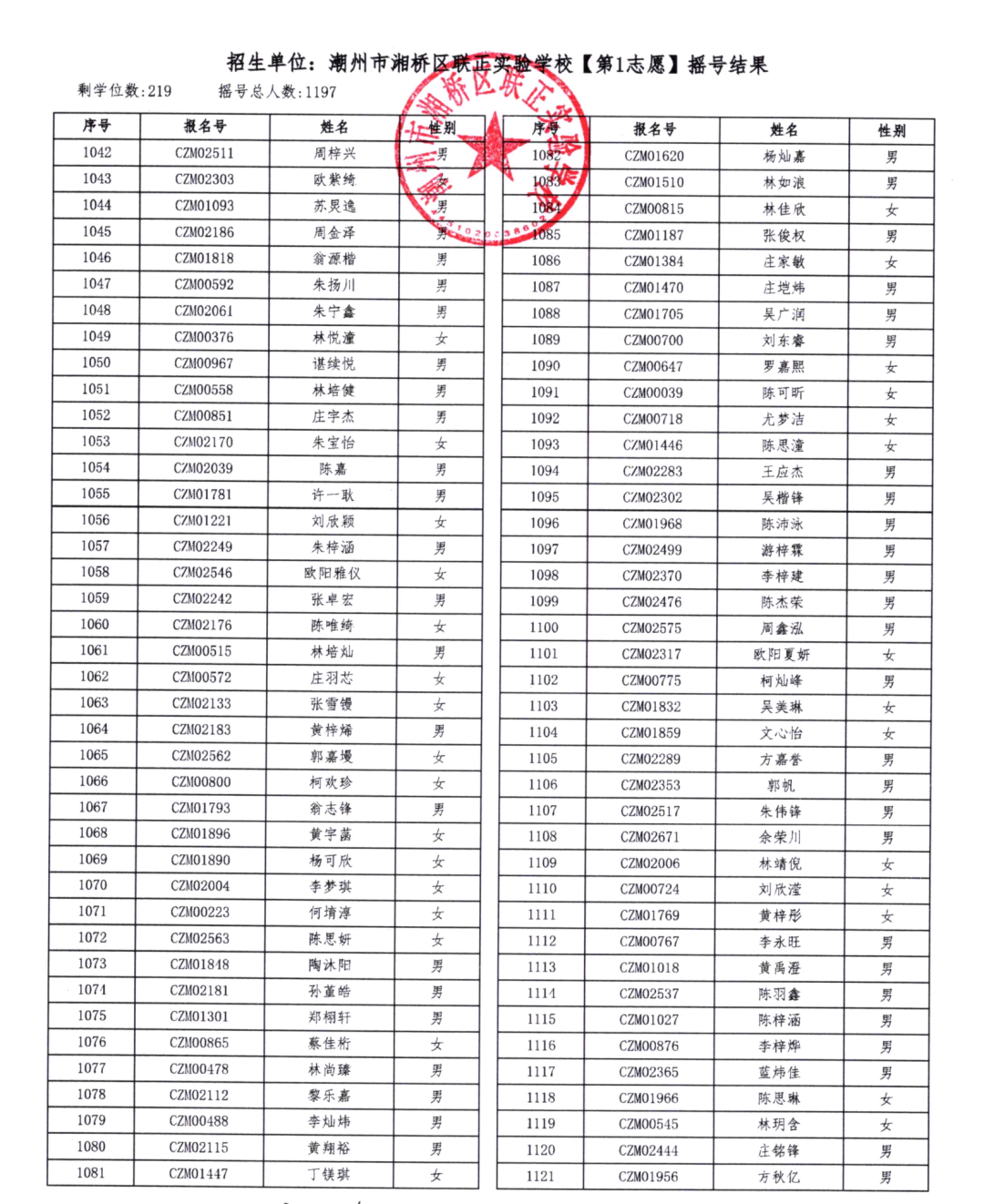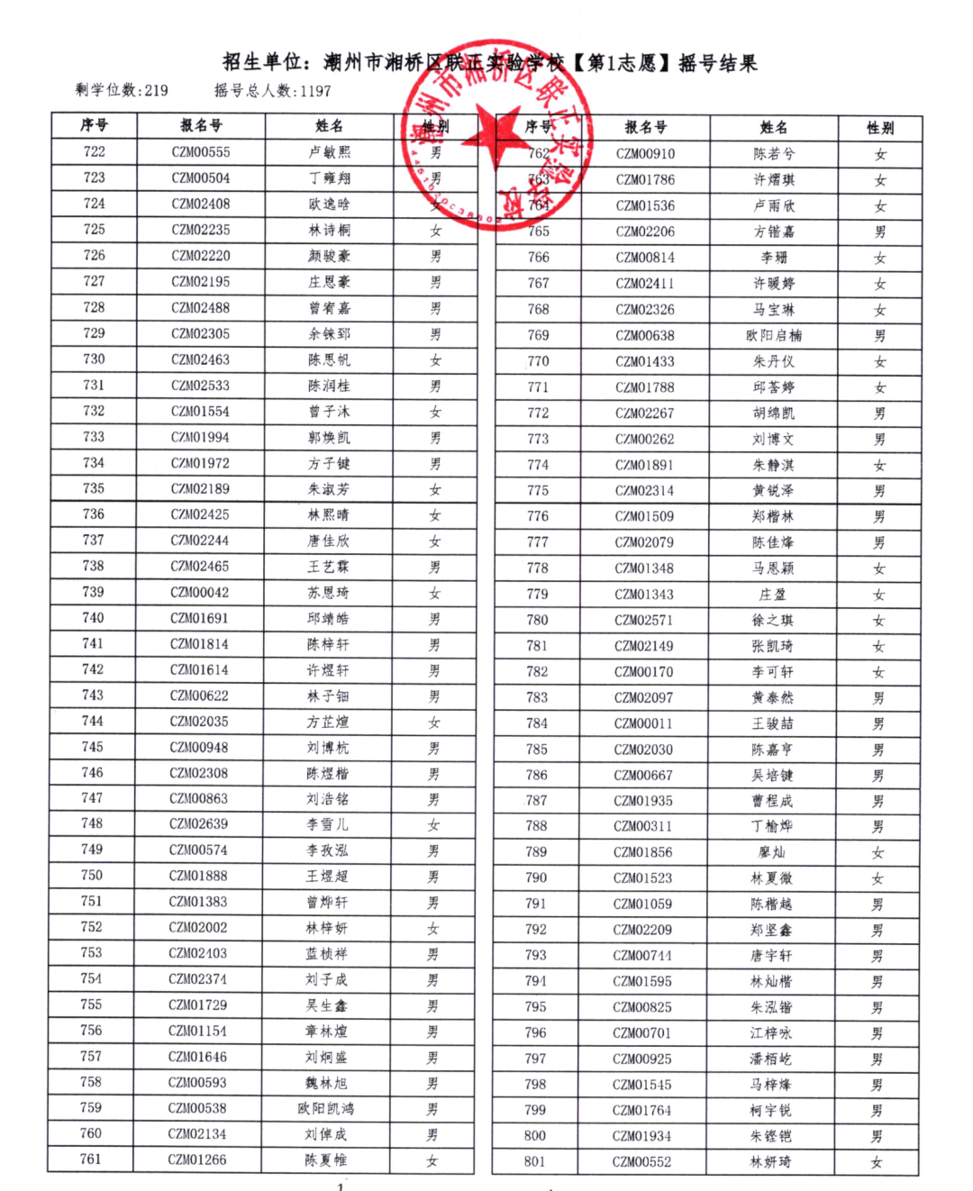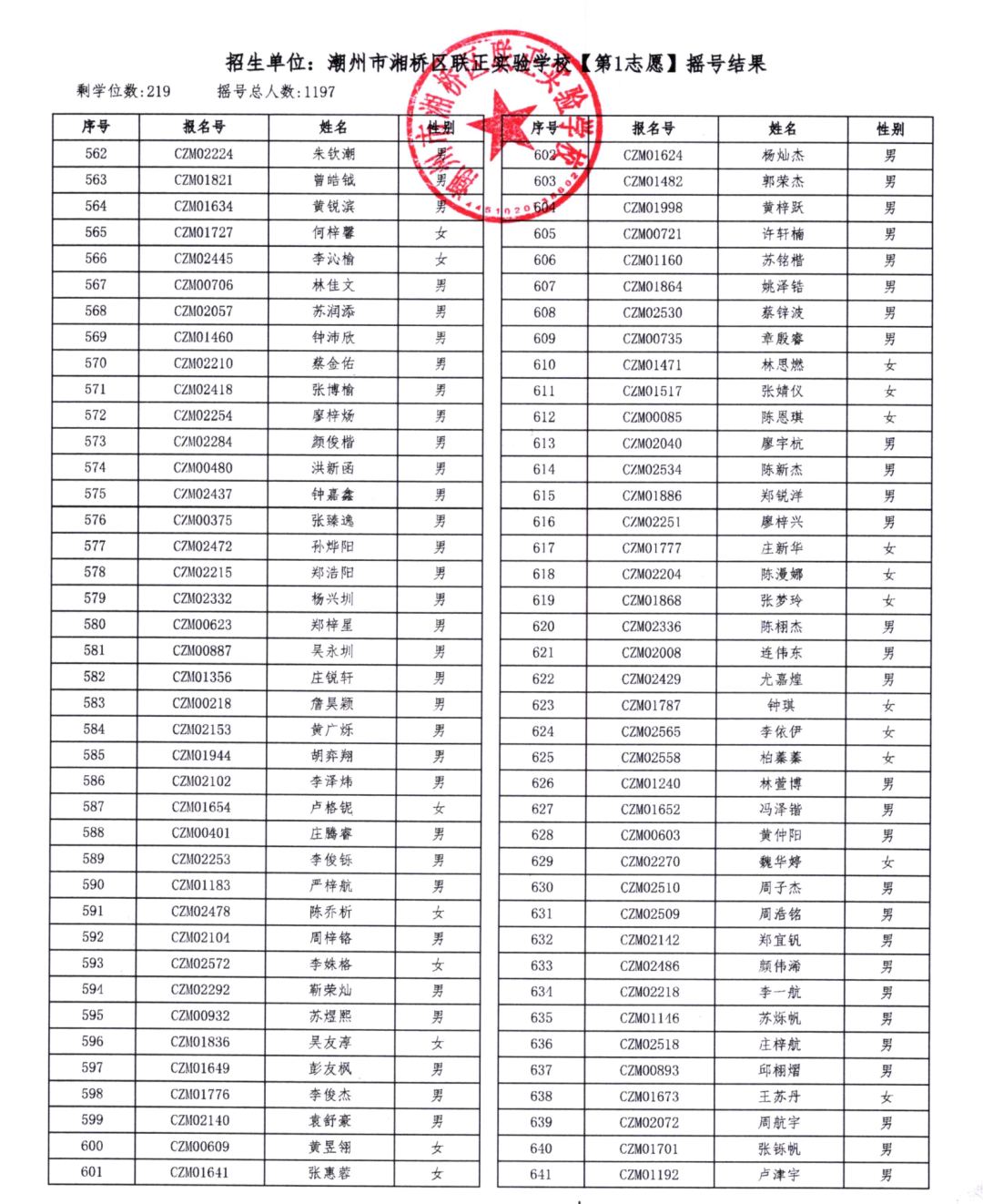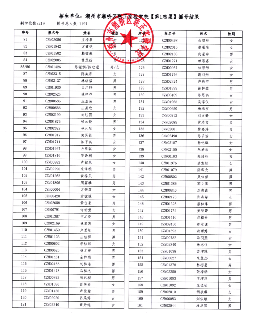 湘橋區聯正實驗學校初中一年級搖號招生結果公布