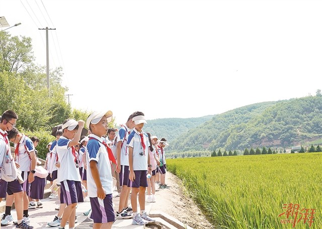 小學(xué)生研學(xué)團(tuán)在陜西省延安市南泥灣千畝稻田景觀前駐足觀賞。 新華社發(fā)