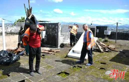 行動中,社區工作人員與志愿者深入轄區老舊居民區,針對天臺地磚破損松動形成積水區域、堆放雜物等問題,逐一清理堆積物品,鏟除青苔雜草,重點對花盆托盤、廢棄桶罐等易積水的小型容器進行傾倒與移除。