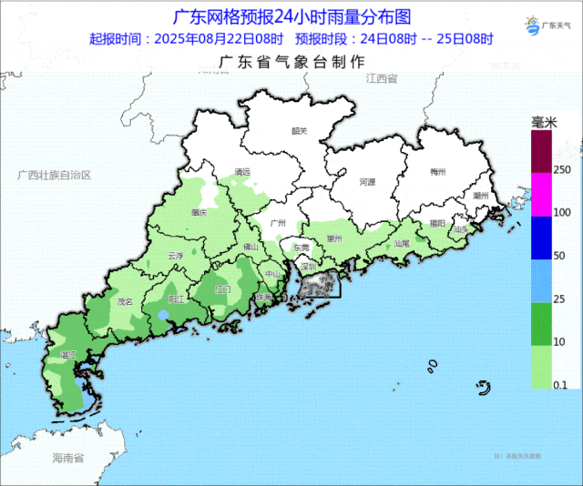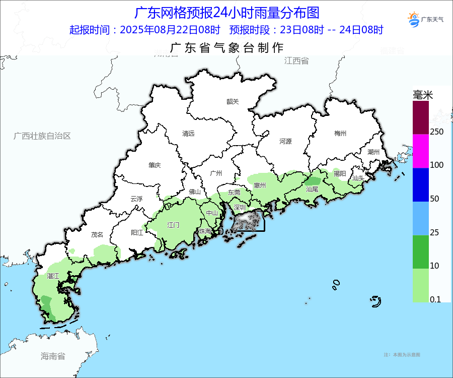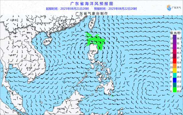 23-25日,粵東海面風力6~7級陣風8級,中西部海面風力6~7級陣風8級轉7~9級陣風10級;南海中北部海面風力6~8級轉9~11級陣風12級,其中臺風中心經過的附近海面旋轉風8~10級轉12~13級陣風15級。24-25日,瓊州海峽和北部灣海面風力6~7級轉9~11級陣風12級。