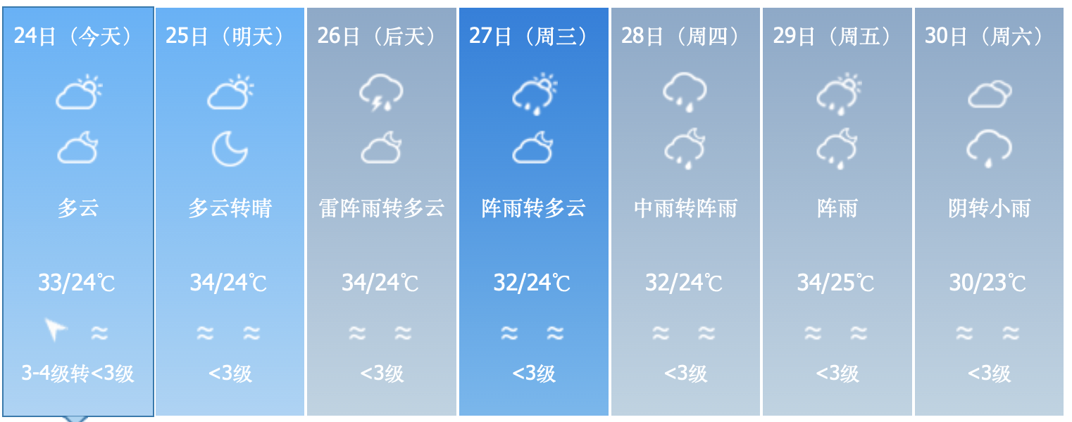 25日最高氣溫:粵北市縣32~35℃,南部沿海市縣27℃~30℃,其余市縣30℃~32℃。