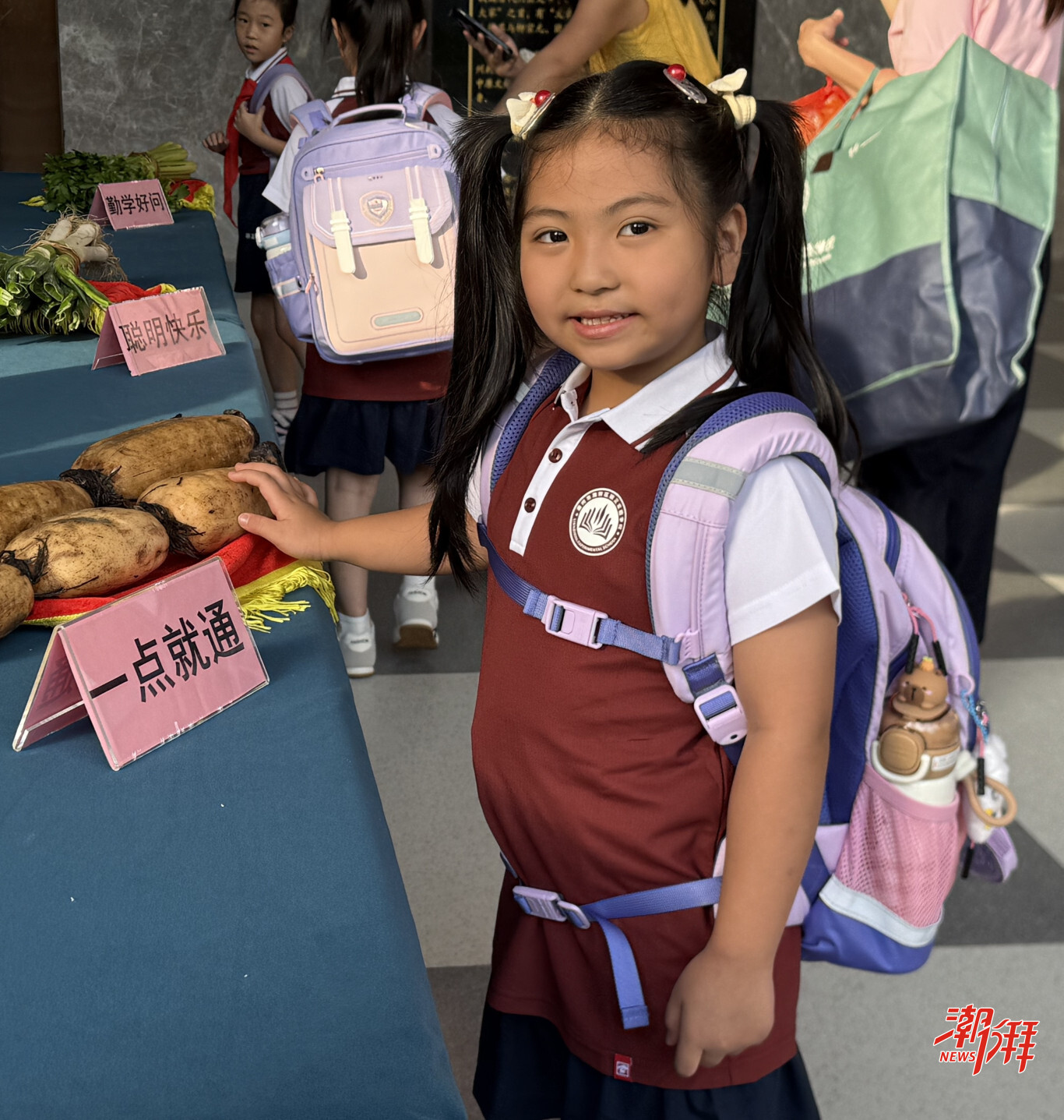 湘橋區聯正實驗學校的校門口,早已被滿滿的儀式感所包裹。同學們背著書包,在家長老師的陪伴下,先在一樓擺放的蔬果展臺前駐足。“摸蘋果保平安,摸蓮藕一點就通!”一旁的老師笑著解釋,展臺里的蘋果、橘子、橙子分別象征“平安喜樂”“大吉大利”“心想事成”,蓮藕、大蔥、芹菜則對應“一點就通”“聰明快樂”“勤奮好學”,都是學校為孩子們準備的開學祝福。走進各班教室,講臺上還放著五彩的開學禮包,黃書琳同學臉上藏不住笑意:“開學既興奮又有點緊張,見到老師和朋友特別開心,希望每天都能這樣!”