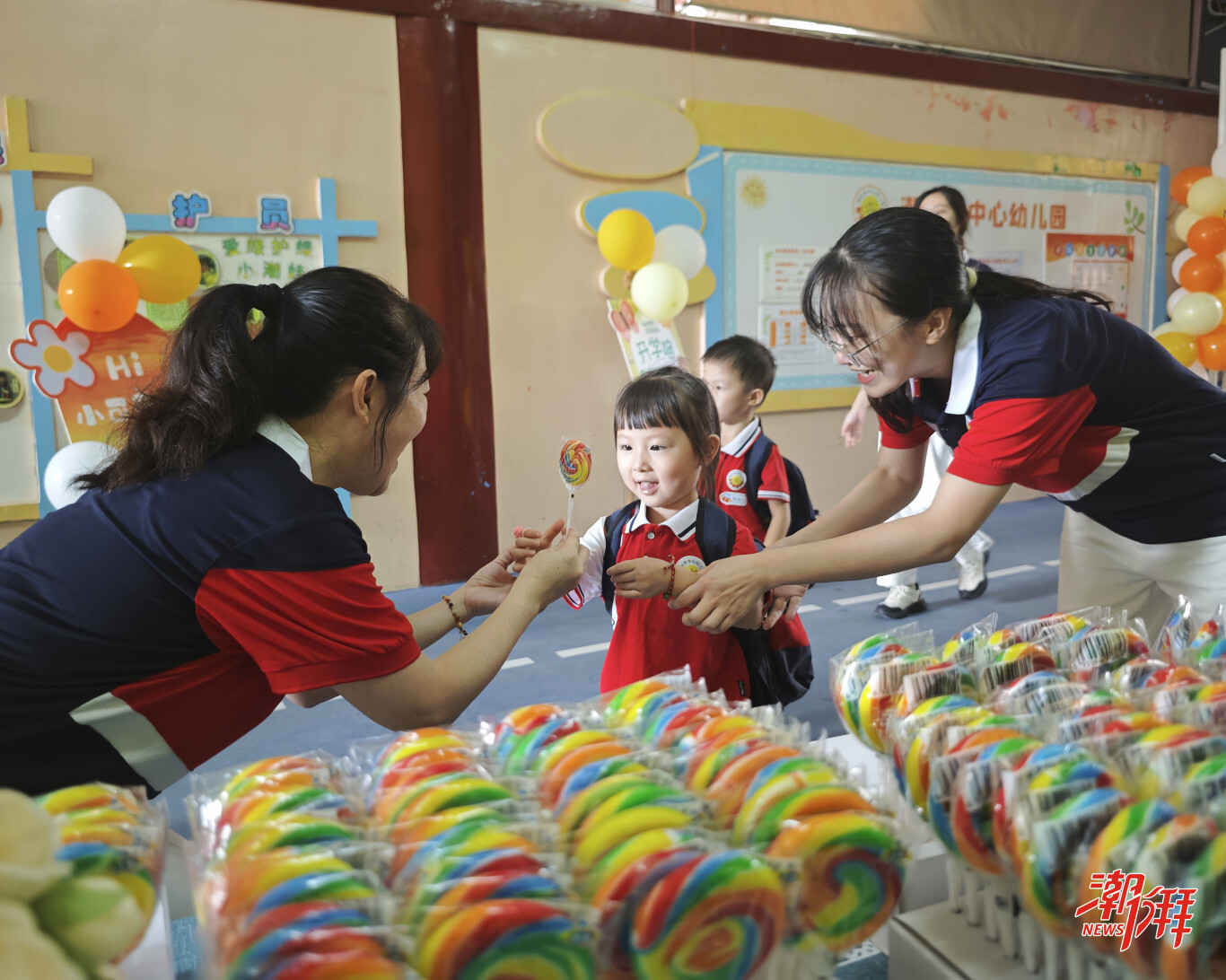 市中心幼兒園里,投擲游戲成了孩子們的最愛。彩色小球在孩子們手中飛舞,朝著印著“‘莓’有煩惱”“‘芒’著可愛”的展板飛去,孩子們通過這小小的投擲,把對新學期的美好愿望送出去。“寶貝,送你棒棒糖,新學期要棒棒噠!”另一邊,老師遞出的棒棒糖裹著彩色糖紙,孩子們接過后,有的偷偷舔一口,有的蹦跳著和小伙伴分享,甜意在校園里蔓延。