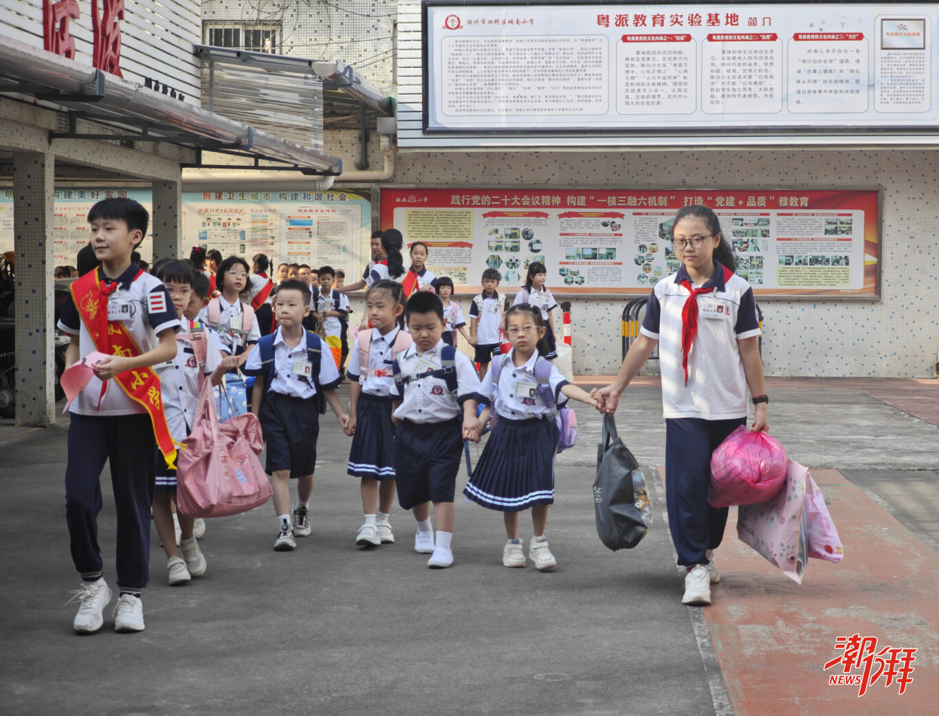 湘橋區城南小學內,高年級的哥哥姐姐帶領新同學到課室。