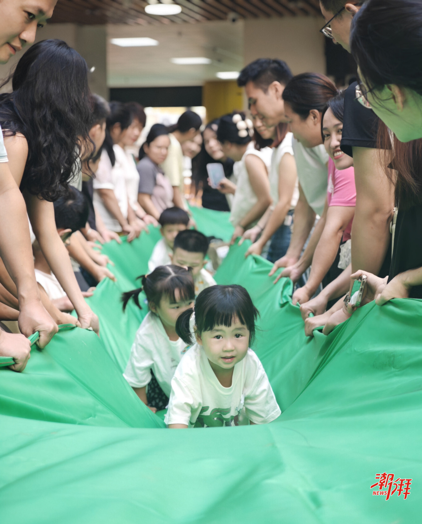 幼兒園里,則是另一番熱鬧景象。綿德幼兒園的手工區,彩色粘土堆成了小山,家長們握著孩子的小手,一起捏出小兔子、小花朵。游戲區里,綠色的布料被家長們拉成“隧道”,孩子們像小探險家一樣爬進去,偶爾探出頭來朝家長笑,家長們的加油聲和孩子的笑聲混在一起,歡歌笑語不斷。