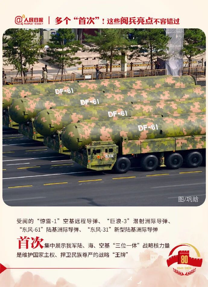 首次集中展示我軍陸、海、空基“三位一體”戰略核力量;