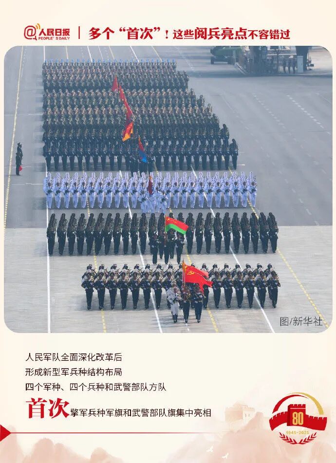 四個軍種、四個兵種和武警部隊方隊首次擎軍兵種軍旗和武警部隊旗集中亮相;