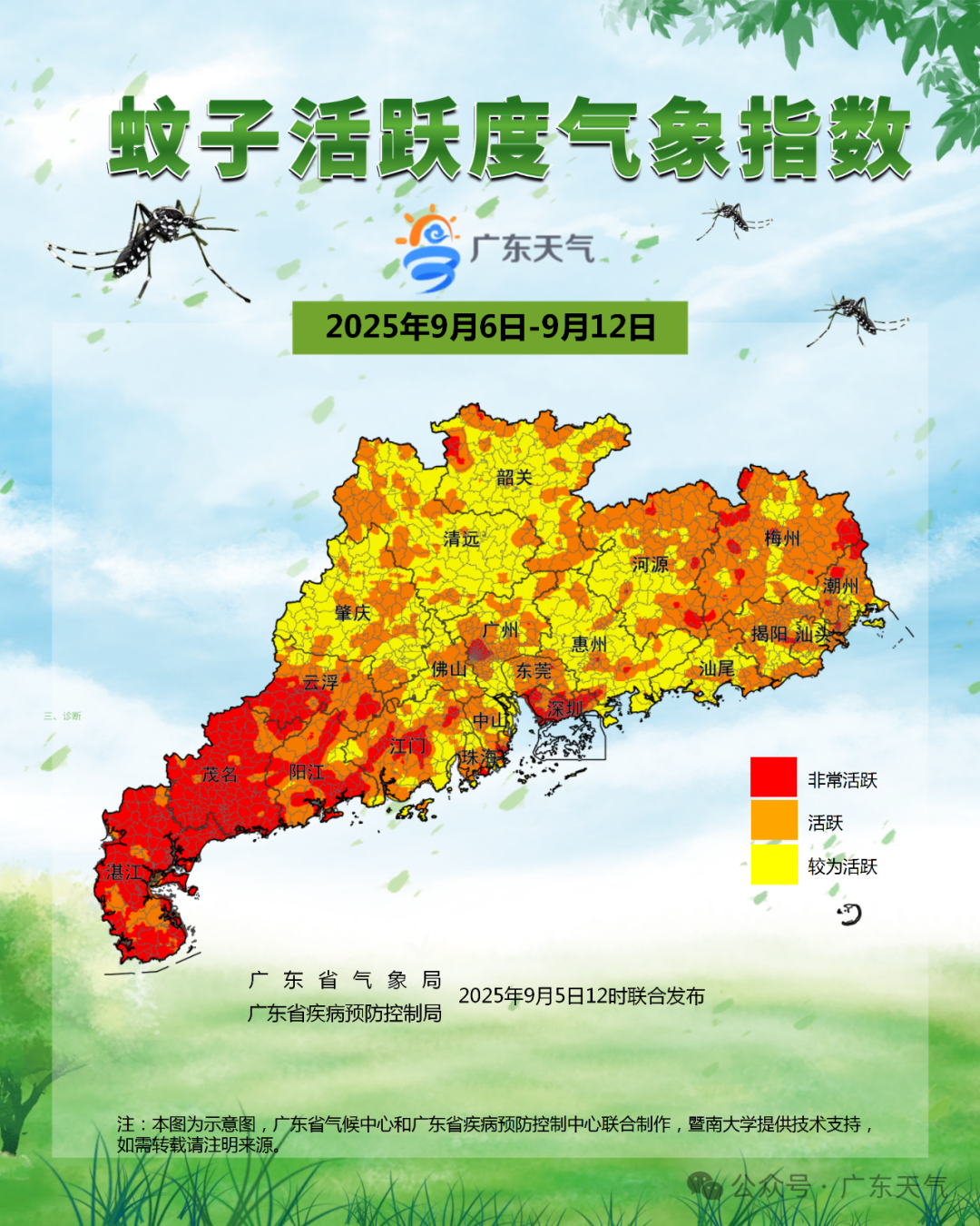 廣東省氣象局、廣東省疾病預(yù)防控制局9月5日12時(shí)聯(lián)合發(fā)布廣東蚊子活躍度氣象指數(shù):預(yù)計(jì)未來一周(9月6日-9月12日),珠三角中南部和粵西市縣以及韶關(guān)北部、云浮南部、梅州、潮州等地人口密集區(qū)蚊子非常活躍,注意做好基礎(chǔ)的防蚊準(zhǔn)備,驅(qū)蚊手環(huán)、驅(qū)蚊液可隨身攜帶。近期基孔肯雅熱、登革熱多發(fā),請公眾要積極行動起來,及時(shí)清理家中及周邊積水,安裝紗門紗窗或使用蚊帳。氣溫變化影響蚊子活躍度,尤其在早上7時(shí)至9時(shí)和傍晚17時(shí)至19時(shí)為伊蚊活動高峰,請做好防護(hù)措施,謹(jǐn)防蚊蟲侵?jǐn)_。