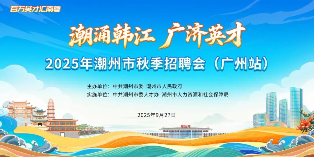 潮涌韓江 廣濟(jì)英才。為深入落實(shí)“百萬英才匯南粵”行動計(jì)劃,促進(jìn)高校畢業(yè)生等各類人才“歸潮向潮”,“百萬英才匯南粵”2025年潮州市秋季招聘會(廣州站)將于9月27日在廣州市廣州大學(xué)城體育中心舉辦。誠邀廣大用人單位和各類求職者參加交流應(yīng)聘。