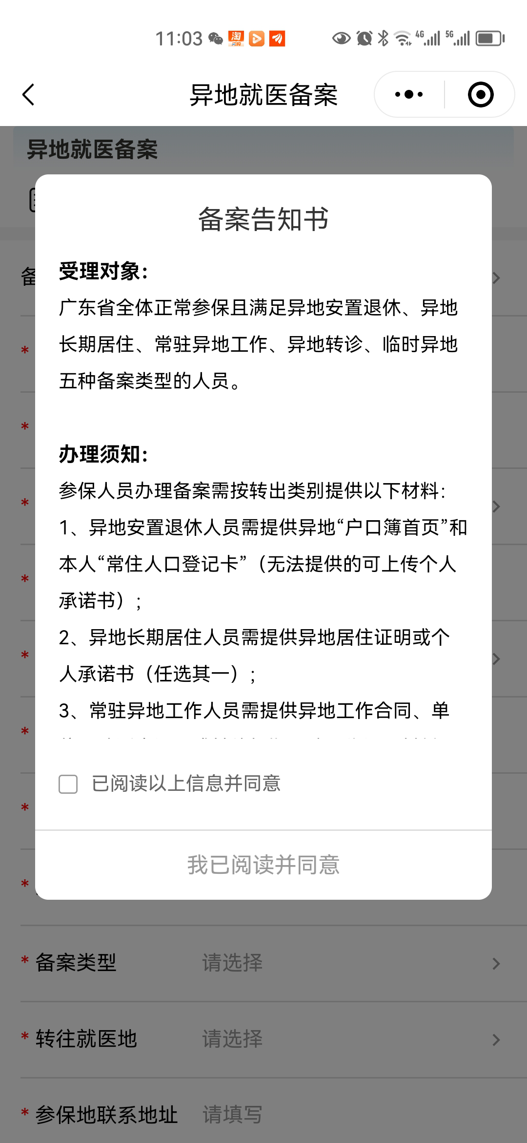 1.微信搜索粵醫保小程序,進入粵醫保小程序-異地就醫備案-選擇備案類型,操作如下: