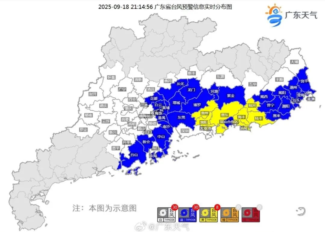 截至18日21時14分,廣東有68個地區(qū)臺風預警信號生效,其中8地區(qū)發(fā)布臺風黃色預警信號,另外粵東部分地區(qū)暴雨和雷雨大風預警信號也在生效中。