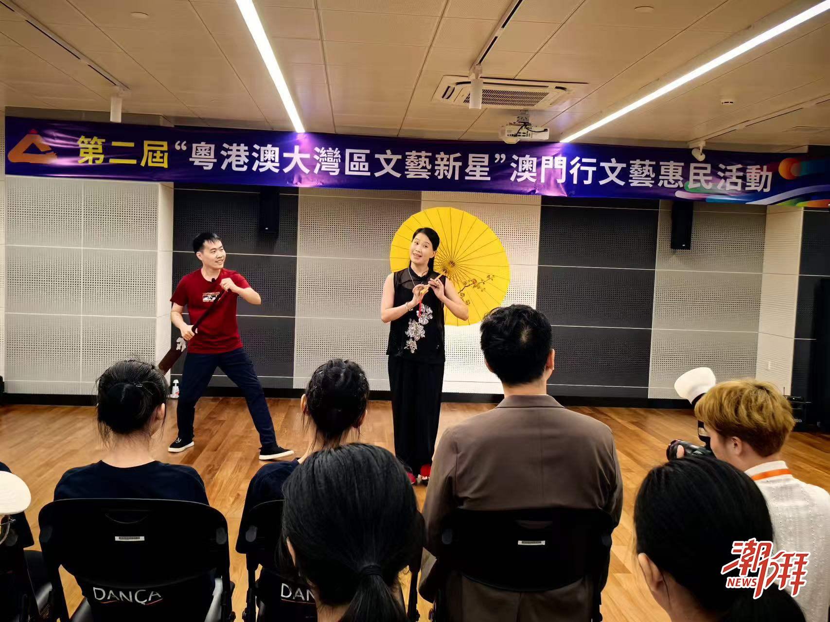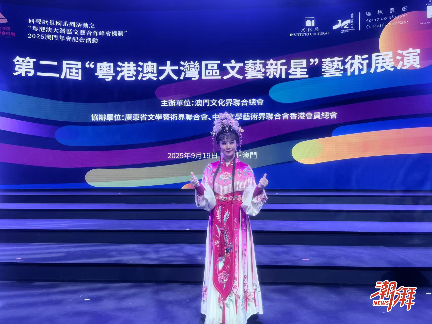 當日下午,第二屆“粵港澳大灣區文藝新星”藝術展演在澳門文化中心精彩上演。黃學嫩以一襲精美的潮劇戲裝亮相舞臺,傾情演繹經典潮劇唱段《人間幸福有萬千》,向觀眾展示了潮劇這一國家級非物質文化遺產的獨特魅力,展現了傳統文化在當代的旺盛生命力。