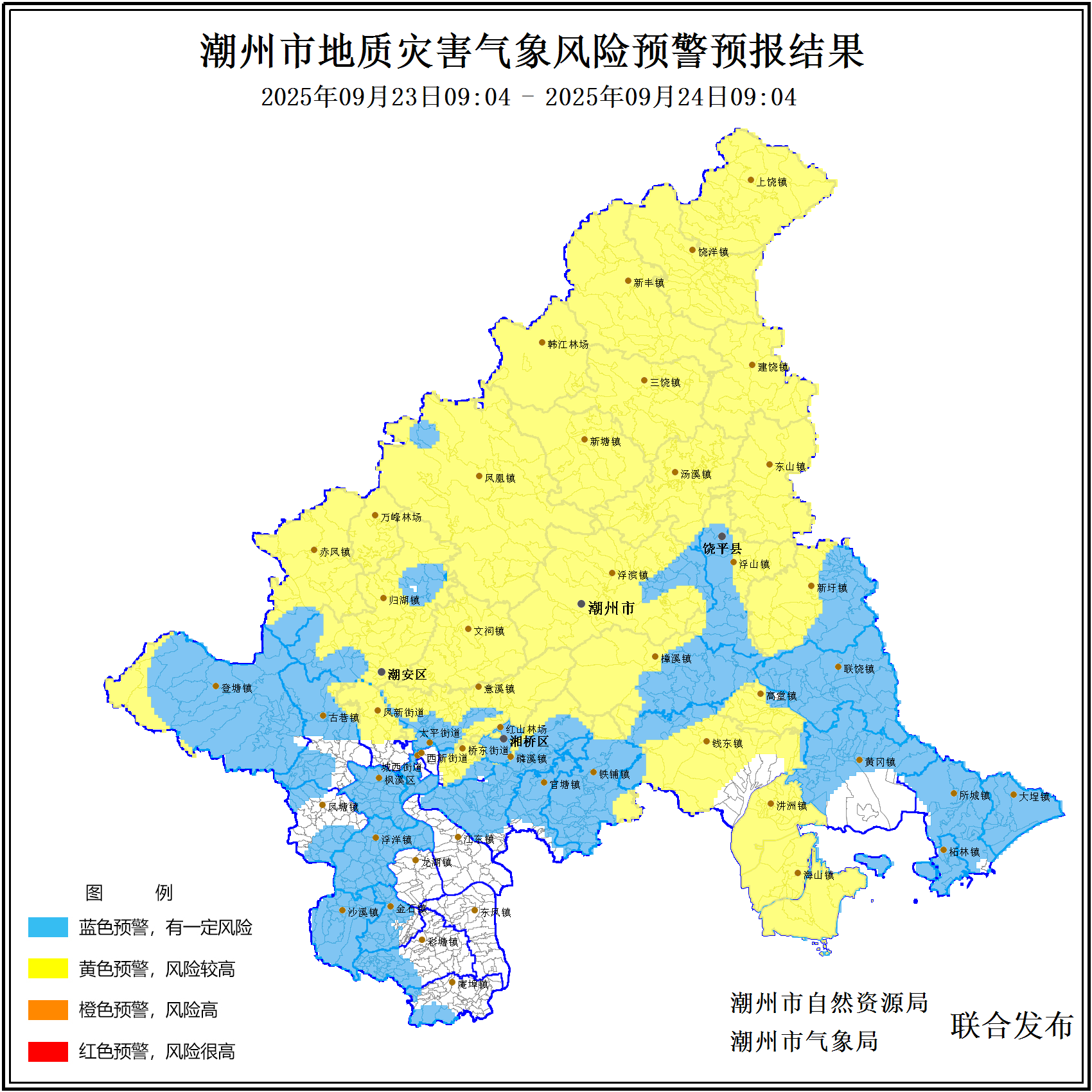 2025年09月23日09時預警消息,預計未來24小時,湘橋區:磷溪鎮、太平街道、官塘鎮、意溪鎮、鐵鋪鎮、鳳新街道、橋東街道,饒平縣:汫洲鎮、錢東鎮、新圩鎮、饒洋鎮、浮濱鎮、樟溪鎮、高堂鎮、三饒鎮、海山鎮、建饒鎮、上饒鎮、韓江林場、新塘鎮、東山鎮、新豐鎮、湯溪鎮、浮山鎮,潮安區:古巷鎮、歸湖鎮、赤鳳鎮、鳳凰鎮、登塘鎮、萬峰林場、文祠鎮等地地質災害氣象風險等級達到3級(黃色)。饒平縣:柘林鎮、大埕鎮、所城鎮、聯饒鎮、黃岡鎮,潮安區:彩塘鎮、沙溪鎮、鳳塘鎮、浮洋鎮、金石鎮、庵埠鎮、楓溪鎮,湘橋區:城西街道、紅山林場等地地質災害氣象風險等級達到4級(藍色)。