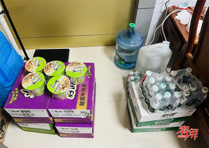 臨時安置點內方便面、礦泉水等生活物資。(潮州日報全媒體記者 陳瑩 攝)