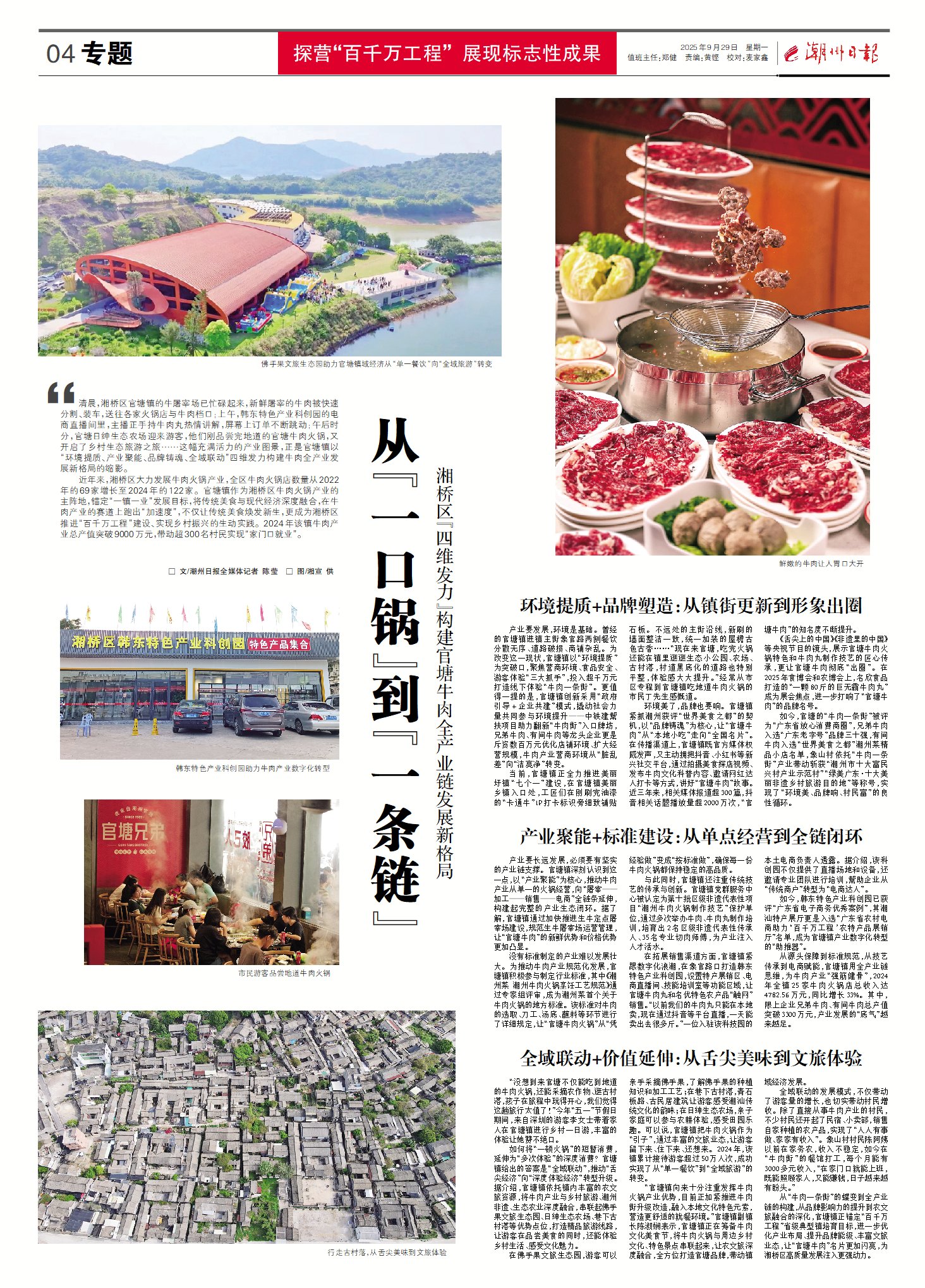清晨,湘橋區官塘鎮的牛屠宰場已忙碌起來,新鮮屠宰的牛肉被快速分割、裝車,送往各家火鍋店與牛肉檔口;上午,韓東特色產業科創園的電商直播間里,主播正手持牛肉丸熱情講解,屏幕上訂單不斷跳動;午后時分,官塘日紳生態農場迎來游客,他們剛品嘗完地道的官塘牛肉火鍋,又開啟了鄉村生態旅游之旅……這幅充滿活力的產業圖景,正是官塘鎮以“環境提質、產業聚能、品牌鑄魂、全域聯動”四維發力構建牛肉全產業發展新格局的縮影。