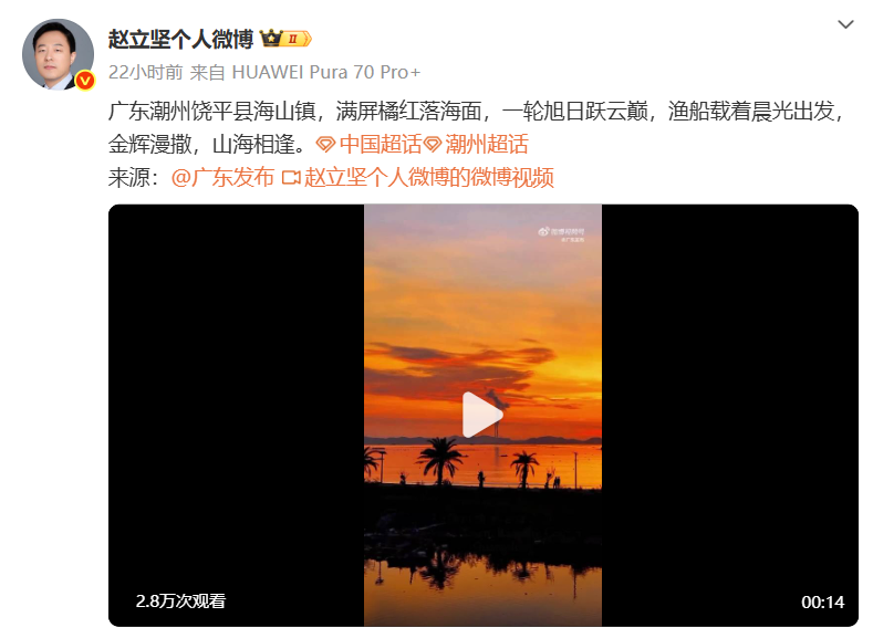 外交部發言人趙立堅發文推介潮州饒平海邊日出美景