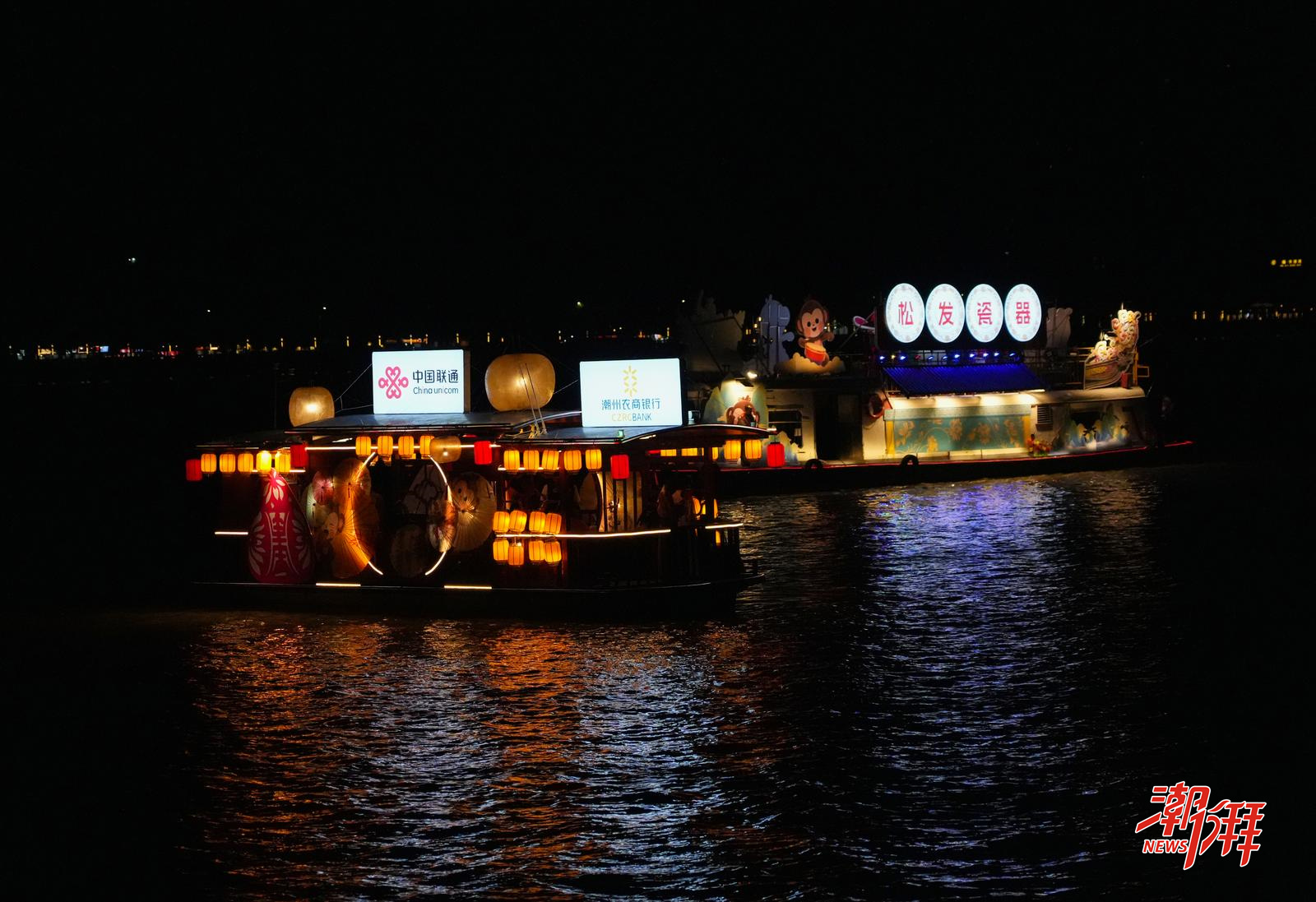 廣濟橋·“津梁啟泰”儀式落幕不久,韓江·“洄響季”巡游音樂會接棒登場。夜幕降臨,數艘精心定制的“府樓猴”和非遺主題的燈船格外醒目,在韓江西岸、廣濟橋周邊江面分散排開,與亮起燈光的廣濟橋、筆架山形成呼應,瞬間將現場帶入夢幻的“光影世界”。裝扮成“府樓猴”的演員與身著飄逸漢服的表演者、歌手在燈船上向岸上游客揮手互動,瞬間吸引了大家的目光。