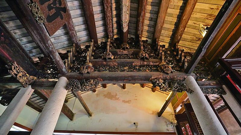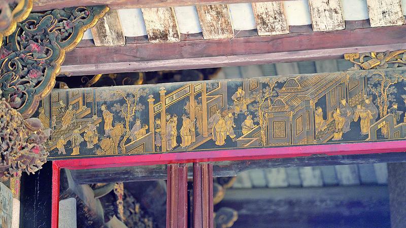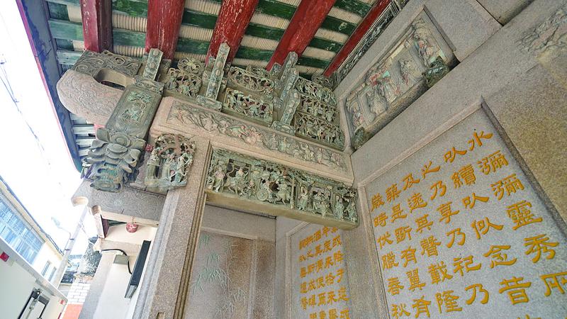 穿過拜亭來到大廳,這里有極具潮州特色的抬梁式梁架:“三載五木瓜十八塊花坯”。“三載”是指三條橫梁。“五木瓜”是指五塊木雕瓜,有多柱受力的作用,同時寓意多子多福。“十八塊花坯”是指由文房四寶、祥云等元素組成的圖案。大廳中央原本放置的是一件神龕,不僅精美絕倫,而且保存完好,現已被潮州市博物館收藏。