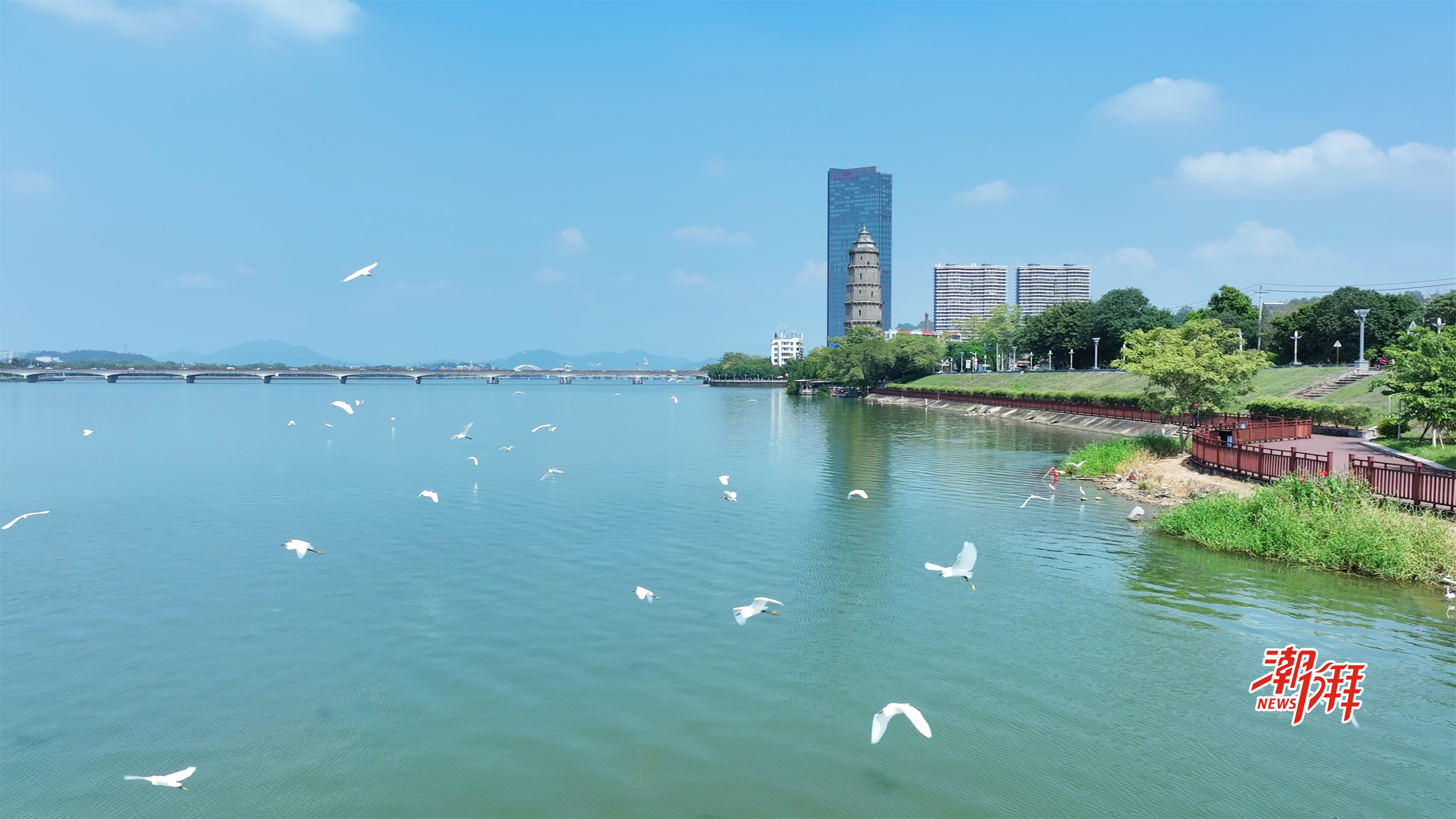 迎著秋日晨光,沿著韓江潮州段溯游而下,一幅流動的生態長卷漸次鋪展——歸湖金舟島畔,藍天如幕,韓江水泛起點點銀光;意溪灘地公園內,綠草茵茵,“人水共生”的詩意暈染在江岸線;仙洲島濱水公園旁,白鷺翩飛,濺起層層漣漪;視線再轉,重建的北溪分洪橋閘飛檐翹角間流淌著古雅韻致,與鳳凰塔交相輝映……