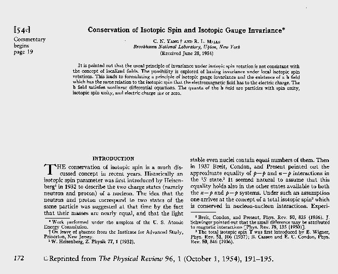 早在芝加哥大學讀研究生時,楊振寧就開始思考拓展電磁學規范不變性的概念,以此統一描述當時發現的層出不窮的基本粒子。1954年,楊振寧與米爾斯提出“非阿貝爾規范場”理論,被后人稱為“楊-米爾斯規范場論”。該理論被認為是麥克斯韋電磁理論之后的規范場論最重要的發展,奠定了后來粒子物理標準模型的基礎,由此發展出“對稱性支配相互作用”的基本思想。粒子物理標準模型是迄今為止描述基本粒子相互作用最基礎的理論,統一了弱相互作用、強相互作用和電磁作用。“楊-米爾斯規范場論”被認為是現代物理學的基石之一,是與麥克斯韋方程和愛因斯坦廣義相對論相媲美的最重要的基礎物理理論之一,并深刻地影響了當代數學的發展。