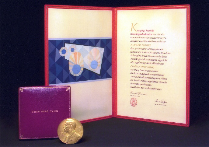 1956年,他與李政道共同發表論文,提出了在弱相互作用下宇稱可以不守恒的思想,并提出了可能的實驗檢驗方案。這個革命性的觀念很快被吳健雄等人的實驗證實。楊振寧與李政道“因他們對宇稱不守恒定律的深刻探索以及由此帶來的基本粒子領域的許多重要發現”,獲得1957年諾貝爾物理學獎,共同成為最早獲得諾貝爾獎的中國人。