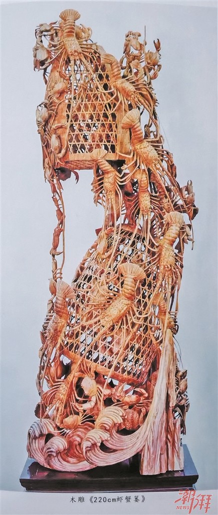 資深木雕工藝美術(shù)師黃水源精心設(shè)計和制作的檀香木《簍中簍蝦蟹簍》,歷時3年之久,在一個直徑只有10多厘米的簍內(nèi)又雕刻出一個小簍,大簍小簍內(nèi)又都雕有爬行的蟹,縱觀整個蝦蟹簍,無論在雕刻技藝方面,還是在雕刻精細方面都達到了一個新的高度,觀賞性強,藝術(shù)價值高。