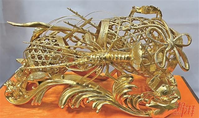 上世紀80年代蟹簍又有新的發(fā)展,廣東省工藝美術(shù)大師陳舜羌,在兒子陳培臣的協(xié)助下,歷時五載,完成了他人生最后的另一巨構(gòu)蟹簍。這件作品直徑70厘米,高183厘米,簍內(nèi)簍外,盤繞著7對龍蝦、24只螃蟹、9尾游魚,作品集浮雕、圓雕、通雕于一體,成為稀世珍品,該作品被廣東省工藝美術(shù)珍品館收藏。而在潮州木雕國家級非遺代表性傳承人、中國工藝美術(shù)大師辜柳希的藝葩木雕廠,卻珍藏著一件巨型龍蝦蟹簍木雕,高達3米左右,雕有30只龍蝦,80只螃蟹,龍蝦姿勢各異,螃蟹張牙舞爪;另外還有縱橫穿梭的海魚,交錯照映的蘆葦,翻騰的浪花等,全方位地再現(xiàn)了生機勃勃的海底世界。這件巨作是由7位師傅歷時5年,對原6000公斤的木頭進行精心雕琢,等到作品完成時只剩下500公斤的重量,耗時耗工之大令人瞠目結(jié)舌,真乃曠世之作。