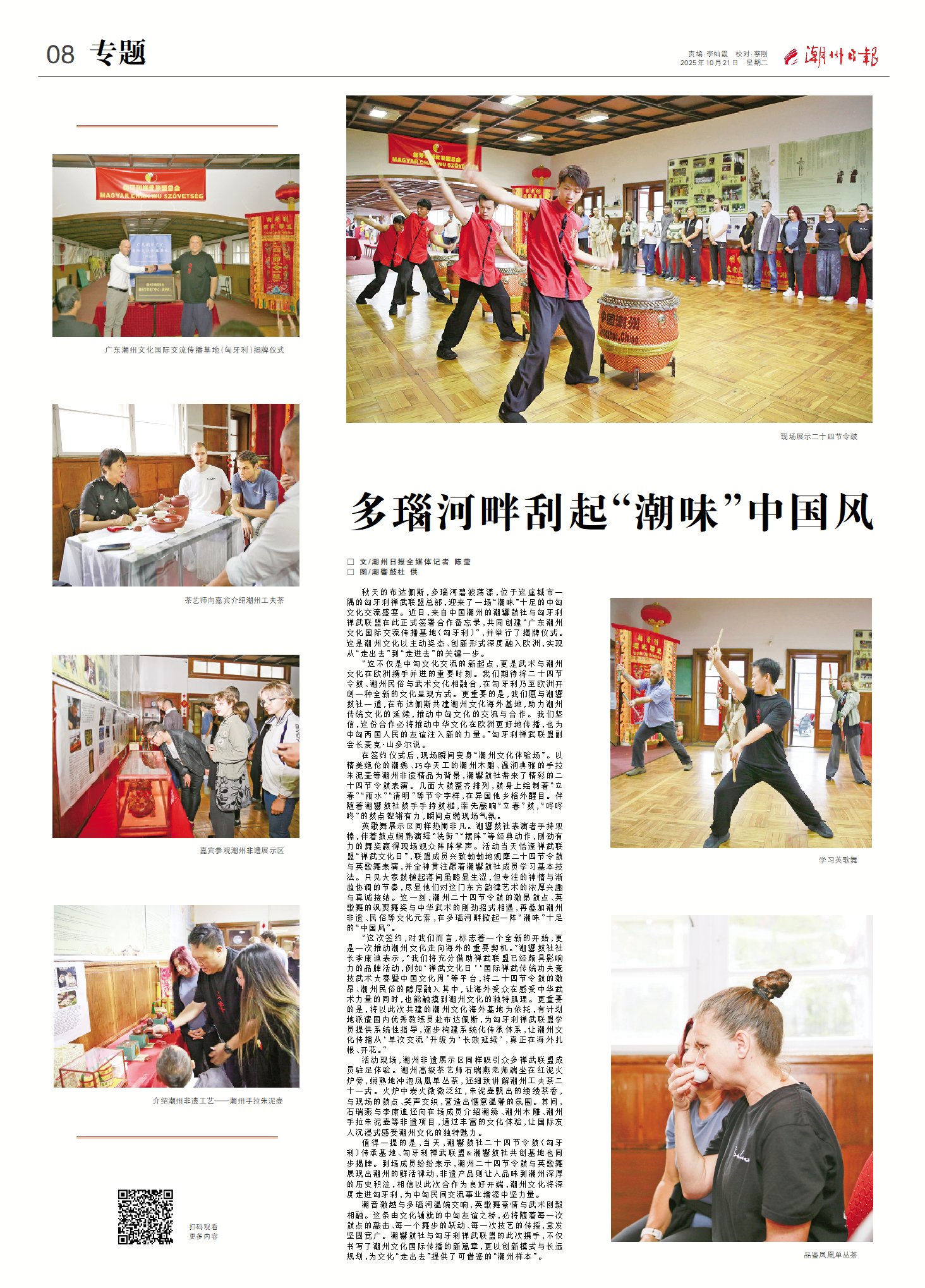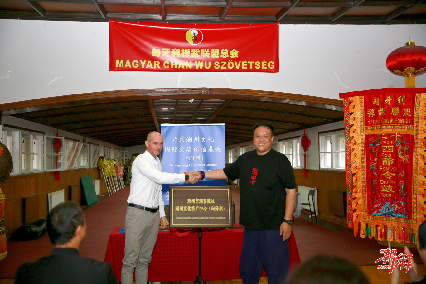 值得一提的是,當天,潮響鼓社二十四節令鼓(匈牙利)傳承基地、匈牙利禪武聯盟&潮響鼓社共創基地也同步揭牌。到場成員紛紛表示,潮州二十四節令鼓與英歌舞展現出潮州的鮮活律動,非遺產品則讓人品味到潮州深厚的歷史積淀,相信以此次合作為良好開端,潮州文化將深度走進匈牙利,為中匈民間交流事業增添中堅力量。