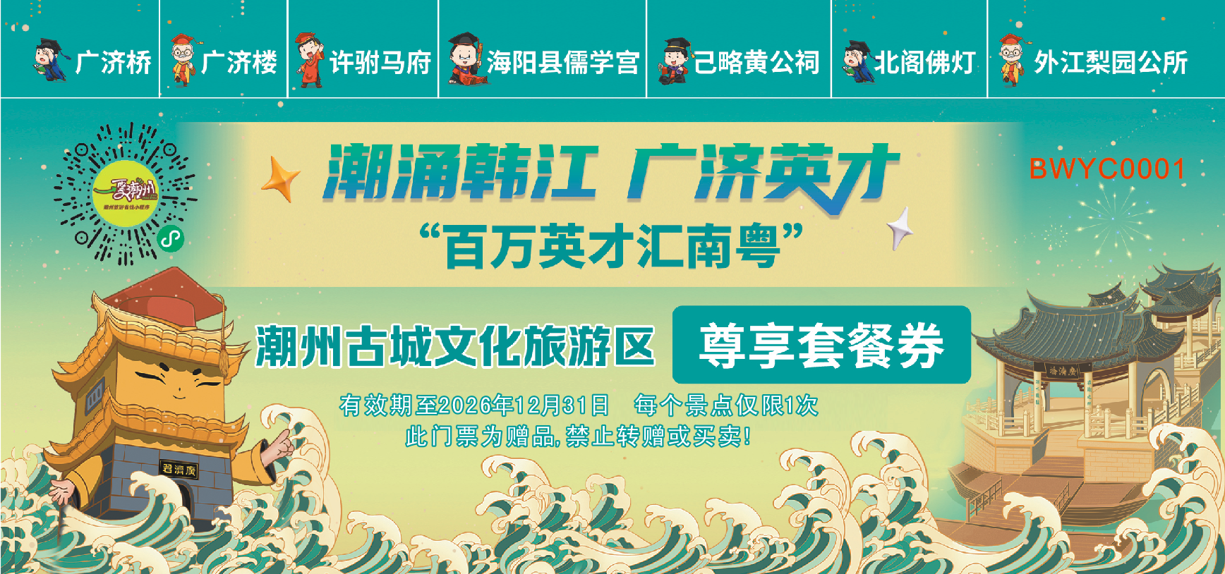 體驗拉滿,求職打卡兩不誤:現場設置非遺互動游戲區、非遺展示區、潮州美食品鑒區,找工作之余還能觀看英歌舞、聽潮劇,打卡“舌尖上的廣東”品嘗潮州美食、喝工夫茶,體驗非遺項目、感受潮州文化。更驚喜的是——入場均可領取4A景區廣濟橋、廣濟樓等潮州古城文化旅游區免費暢游券及特色禮品!