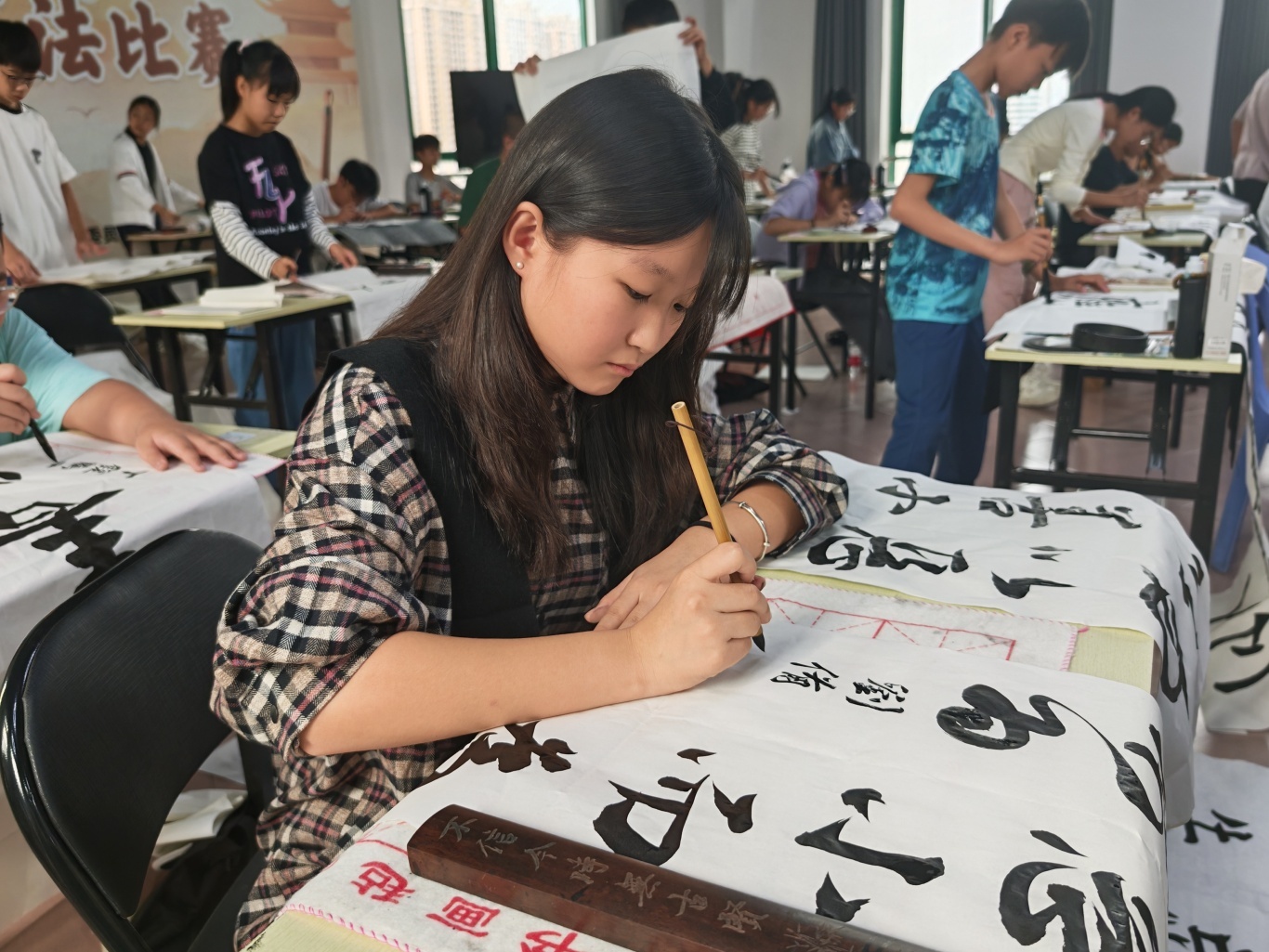 “在這里遇到了許多志同道合的小伙伴,還得到了不少老師的指導,期待能取得好成績。”參賽選手丁爍欣說。另一位選手蔡華芯也談及參賽感受:“特別熱愛書法,參加這次比賽,認識了很多同樣喜歡書法的朋友,這次比賽我寫了高適的《別董大》,希望能拿到讓自己滿意的成績。”