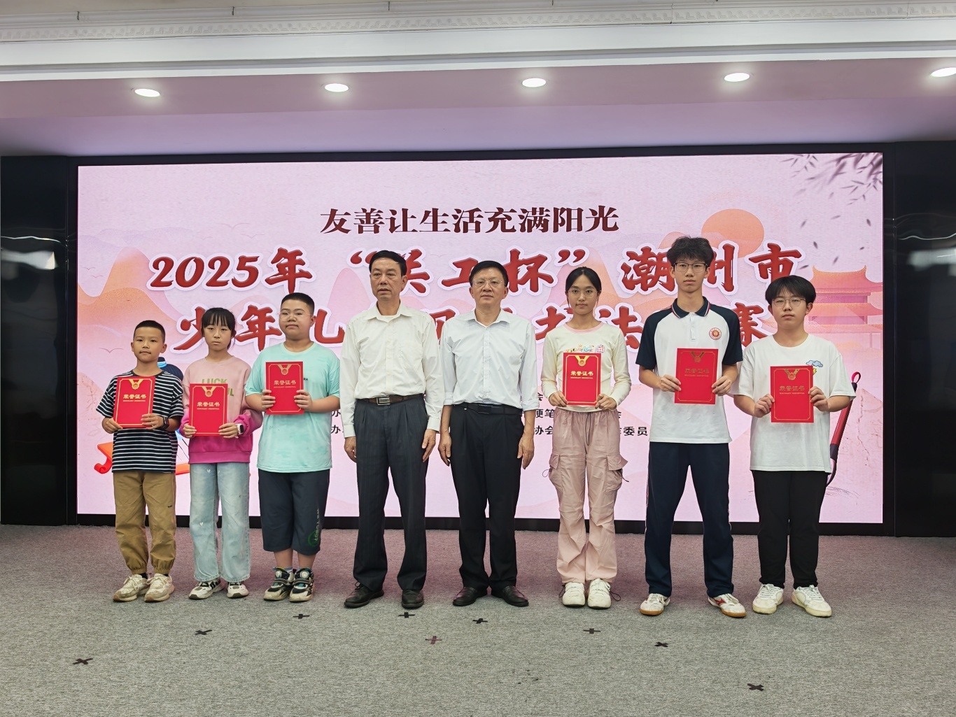 頒獎儀式上,各組別獲獎名單正式公布。其中,兒童組一等獎由林詩蔓、丁銳騰、陳潤堉摘得,少年組一等獎歸屬程立熙、詹松濱、丁爍欣,所有獲獎者均獲得榮譽證書,一、二等獎獲得者還將獲得相應獎金,并可申請加入潮州市書法家協(xié)會小書家工作委員會。
