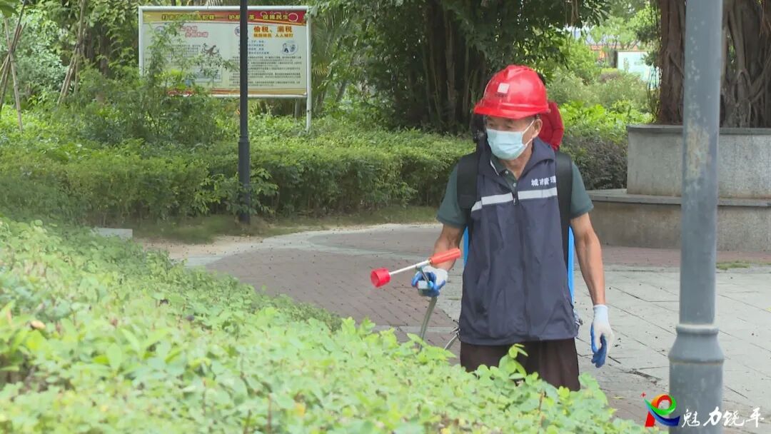 日前,在饒平縣城濱河公園,工作人員在對綠化帶、草叢、衛生死角等蚊蟲孳生地進行藥物噴灑。在鳳江廣場,工作人員在除草,減少蚊蟲孳生地,降低蚊媒密度。