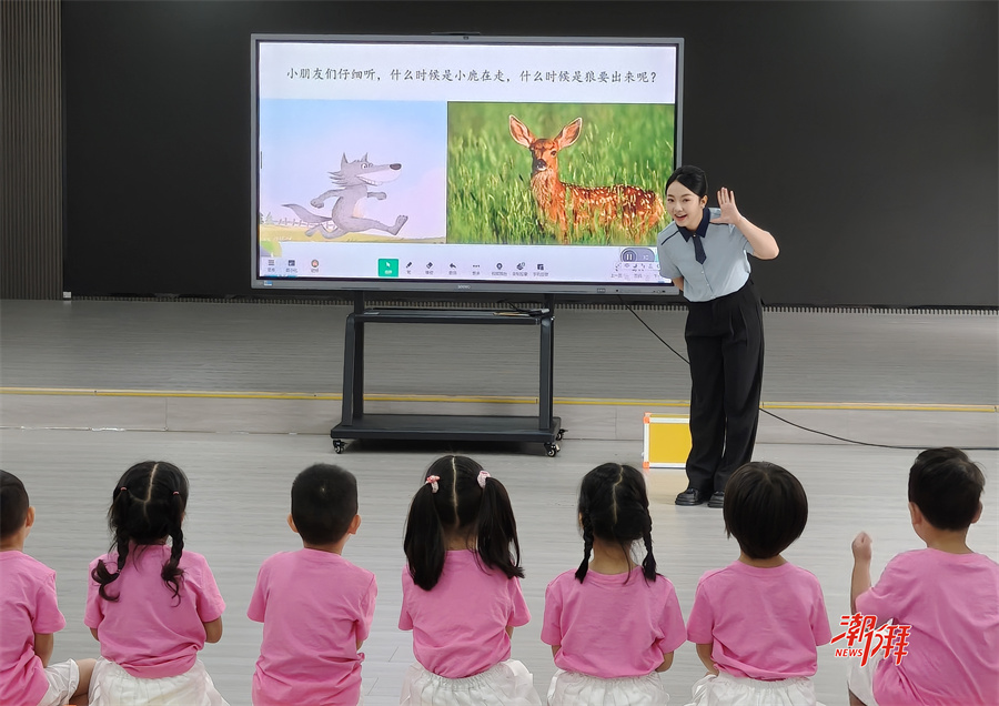 上午9時,教室里響起歡快的旋律,歐婷采用音樂指令引導孩子們圍坐成圈,開啟新一天的音樂課。“小朋友們聽,這是小鹿的聲音。”只見她按下播放鍵,接著又切換旋律,“注意啦,大灰狼來啦,小鹿快躲起來!”剎那間,孩子們的模仿聲、笑聲與音樂交織,孩子們在角色的代入中,通過歌唱與律動,感知音高與強弱的對比。