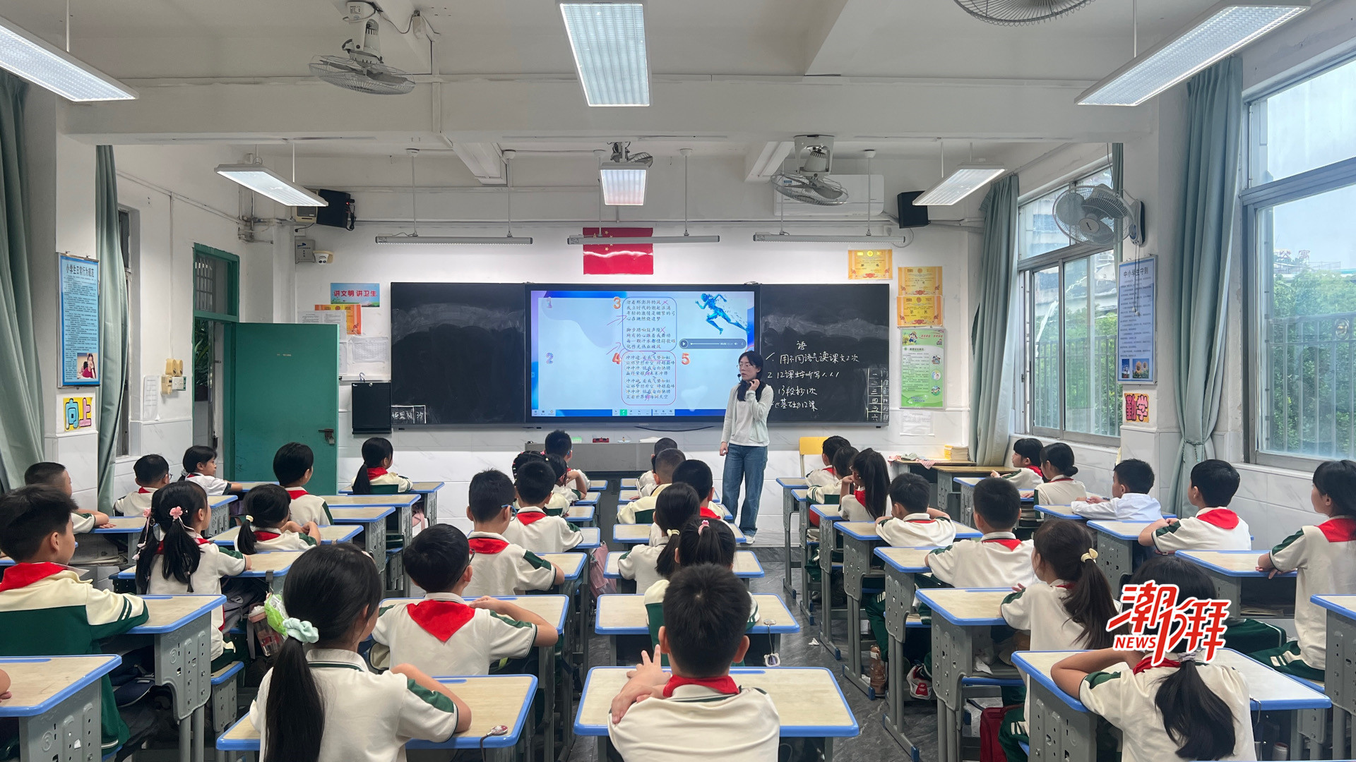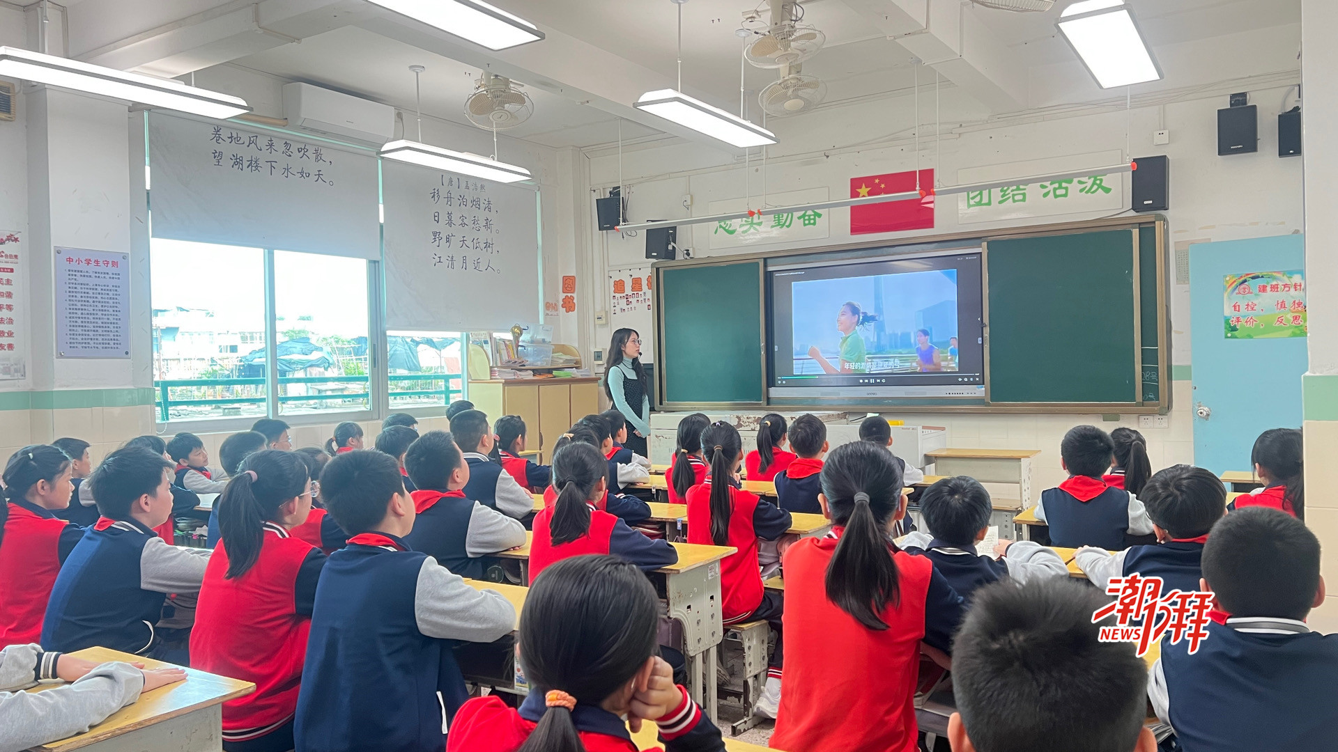 同樣熱烈的場景,也在湘橋區錚蓉小學的課堂上演。學生們整齊悅耳的合唱在教室里回蕩。該校音樂老師楊老師采用“分段教學法”,先逐句示范,幫助學生把握音準,再分段落講解歌詞與節奏,細致闡釋“熱血破風”背后的體育精神,引導學生感受旋律中蘊含的奮進力量。在老師的耐心指導下,孩子們的跟唱愈發熟練,唱出校園中最動聽的“迎盛會序曲”。