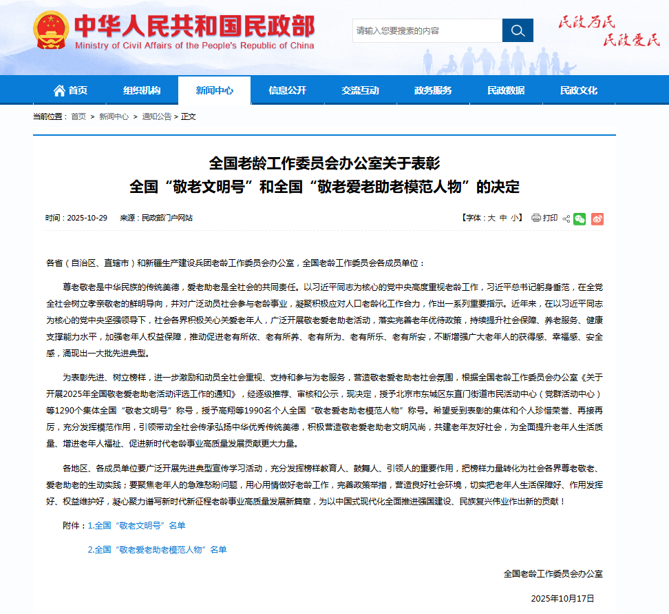 10月29日,2025年全國敬老愛老助老活動評選結果公布,授予1290個集體全國“敬老文明號”稱號和1990名個人全國“敬老愛老助老模范人物”稱號,其中,我市1個集體和2名個人上榜!