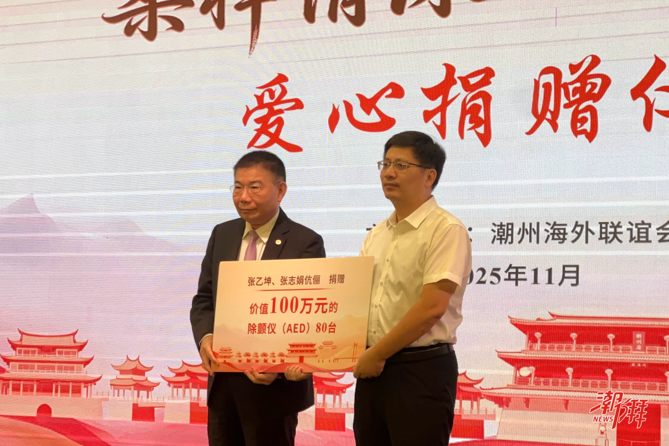 國(guó)際潮團(tuán)總會(huì)永遠(yuǎn)榮譽(yù)主席張乙坤、張志娟伉儷捐贈(zèng)價(jià)值100萬(wàn)元的除顫儀80臺(tái)。