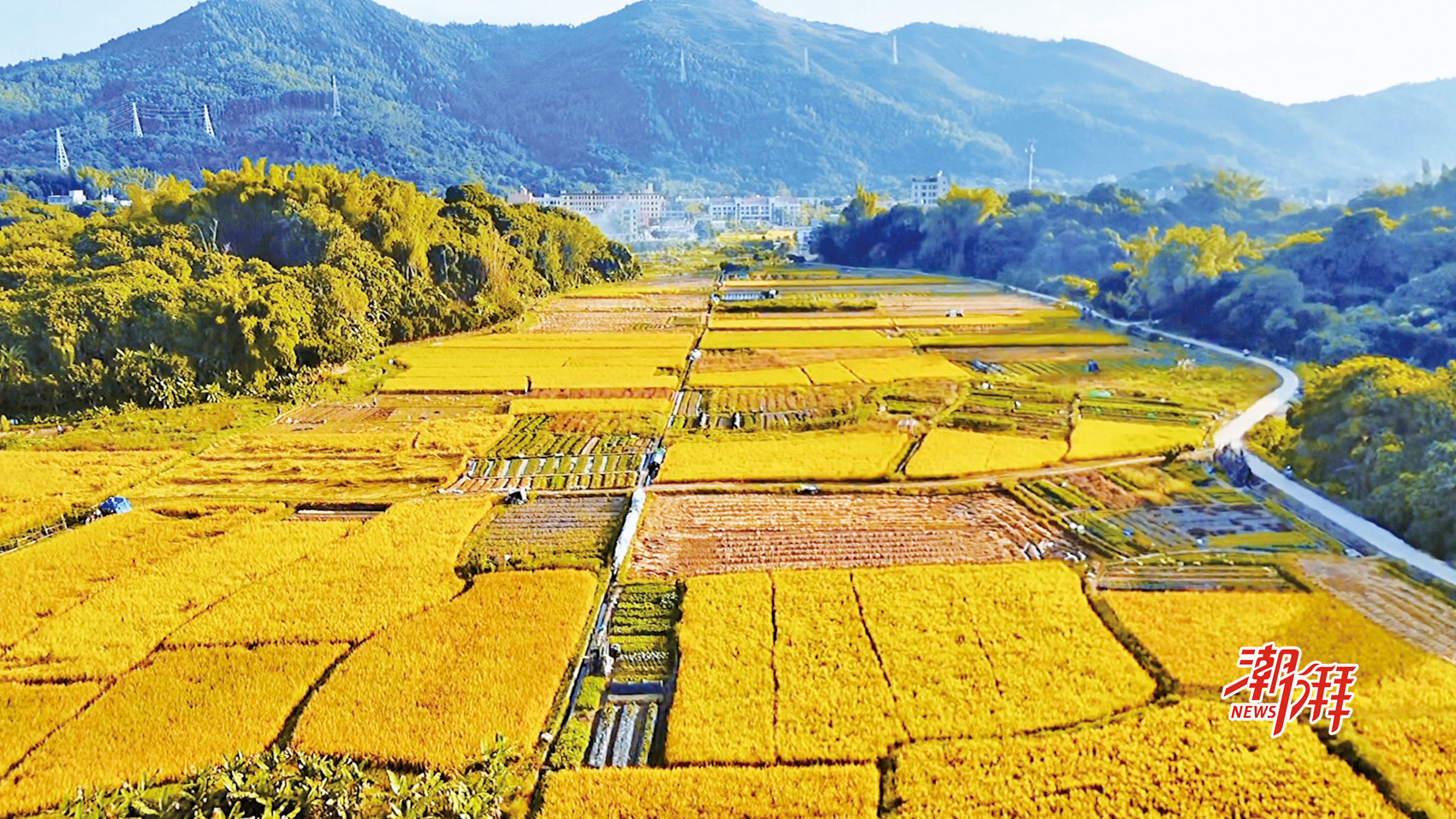 風掠過山坳,整片稻田頓時漾起流動的金色波浪。沉甸甸的稻穗彎出飽滿的弧度,在秋日晴空下鋪展成遼闊的織錦——近處是黃綠交錯的細膩層次,遠處與青山相連,化作溫暖的浪濤,連天邊的云絮都染上了稻穗的溫潤。