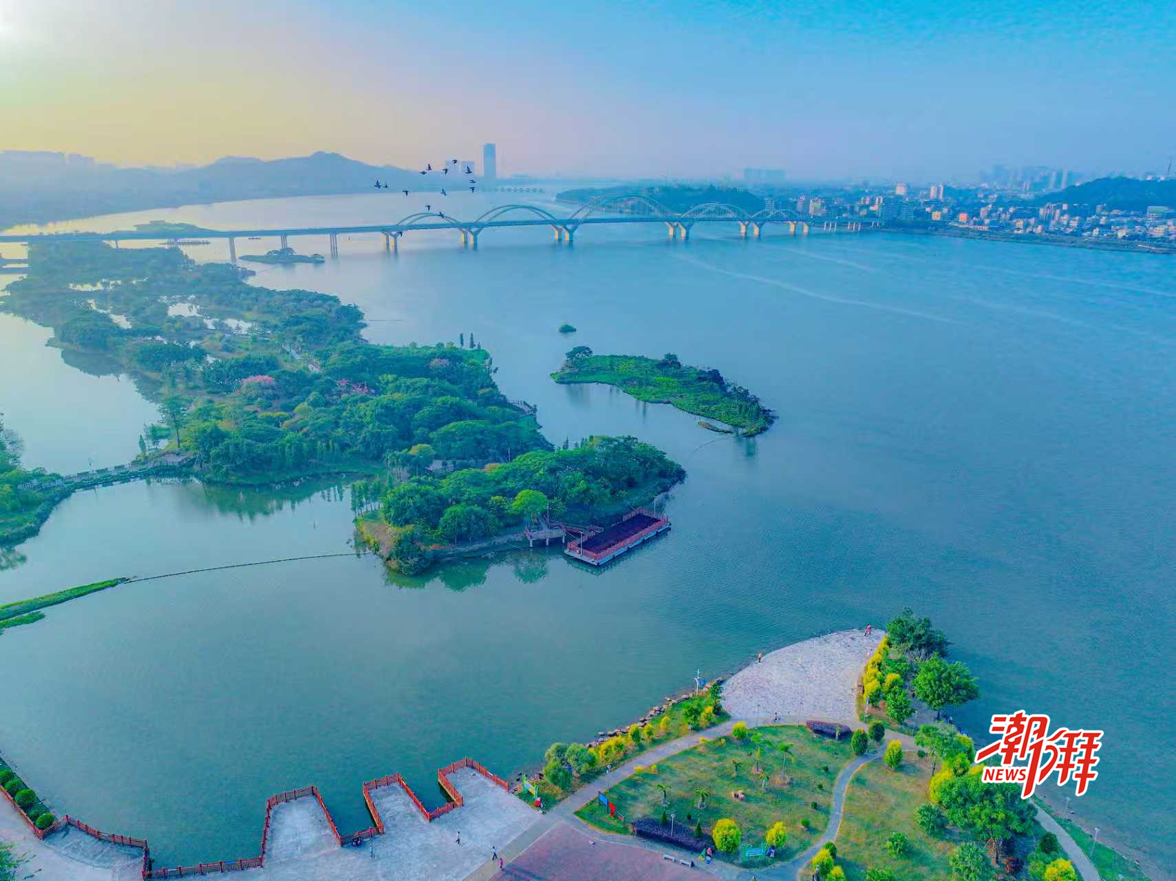 潮州韓江之上,濕地公園風光旖旎,與澄澈如鏡的江面相映成趣。綠意盎然的島嶼宛若翡翠,成群飛鳥翩然翱翔,為這幅畫卷增添了靈動意韻。對岸城市建筑與如黛遠山在天際線下交相呼應,勾勒出一幅清新雅致、如詩如畫的“山水城景”圖。